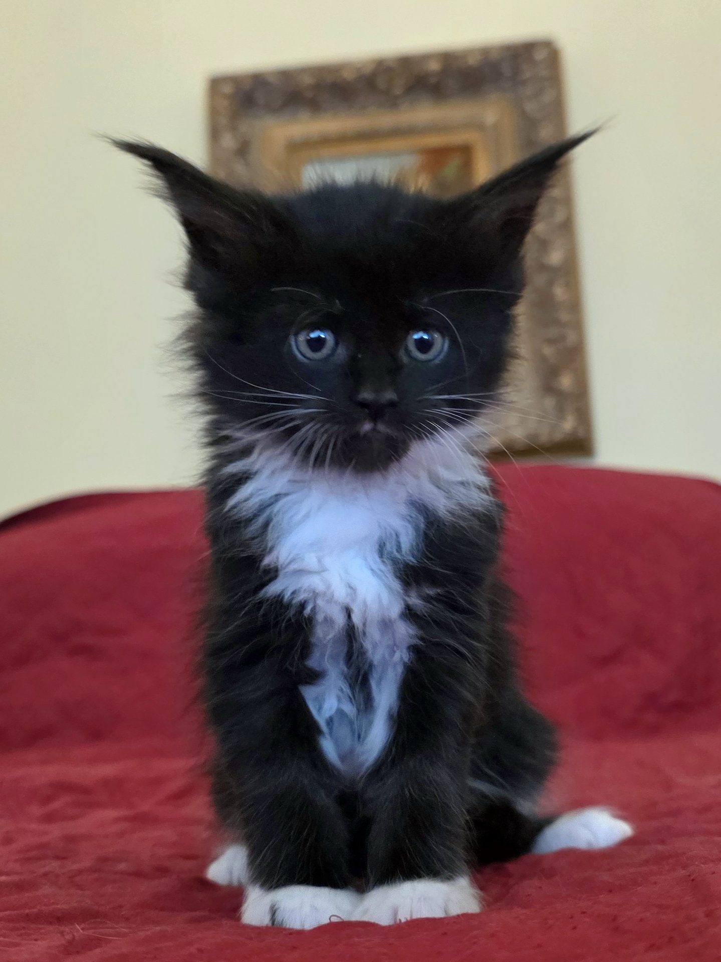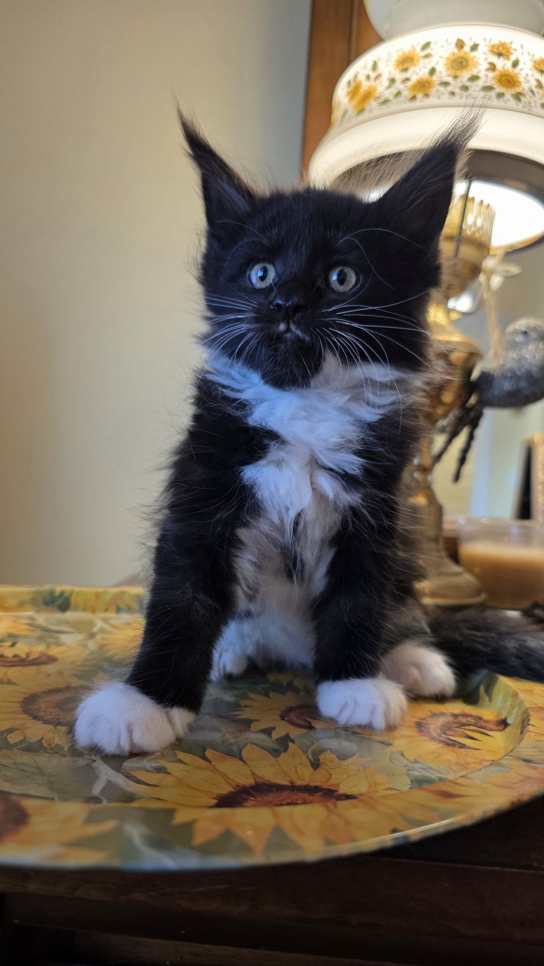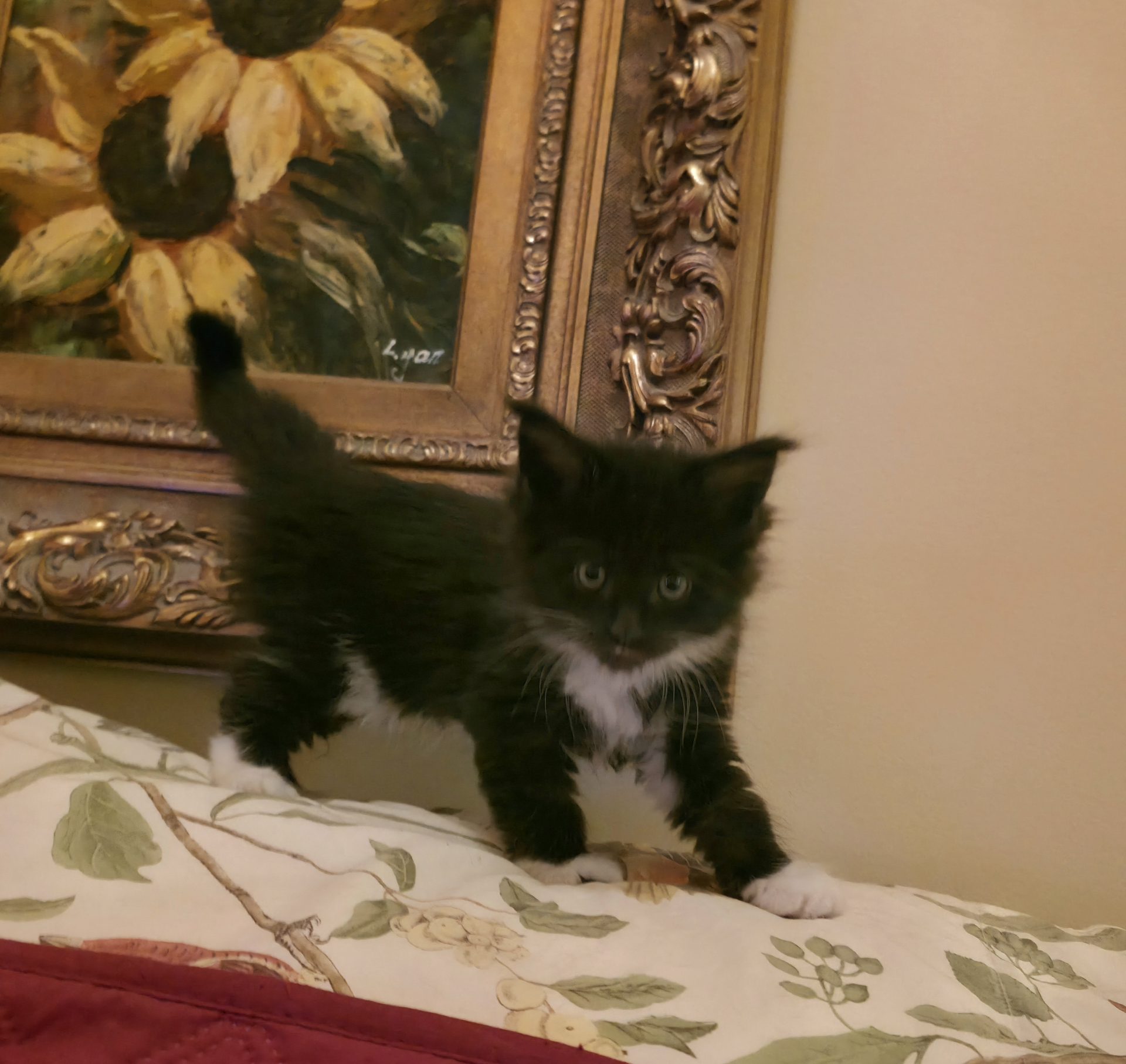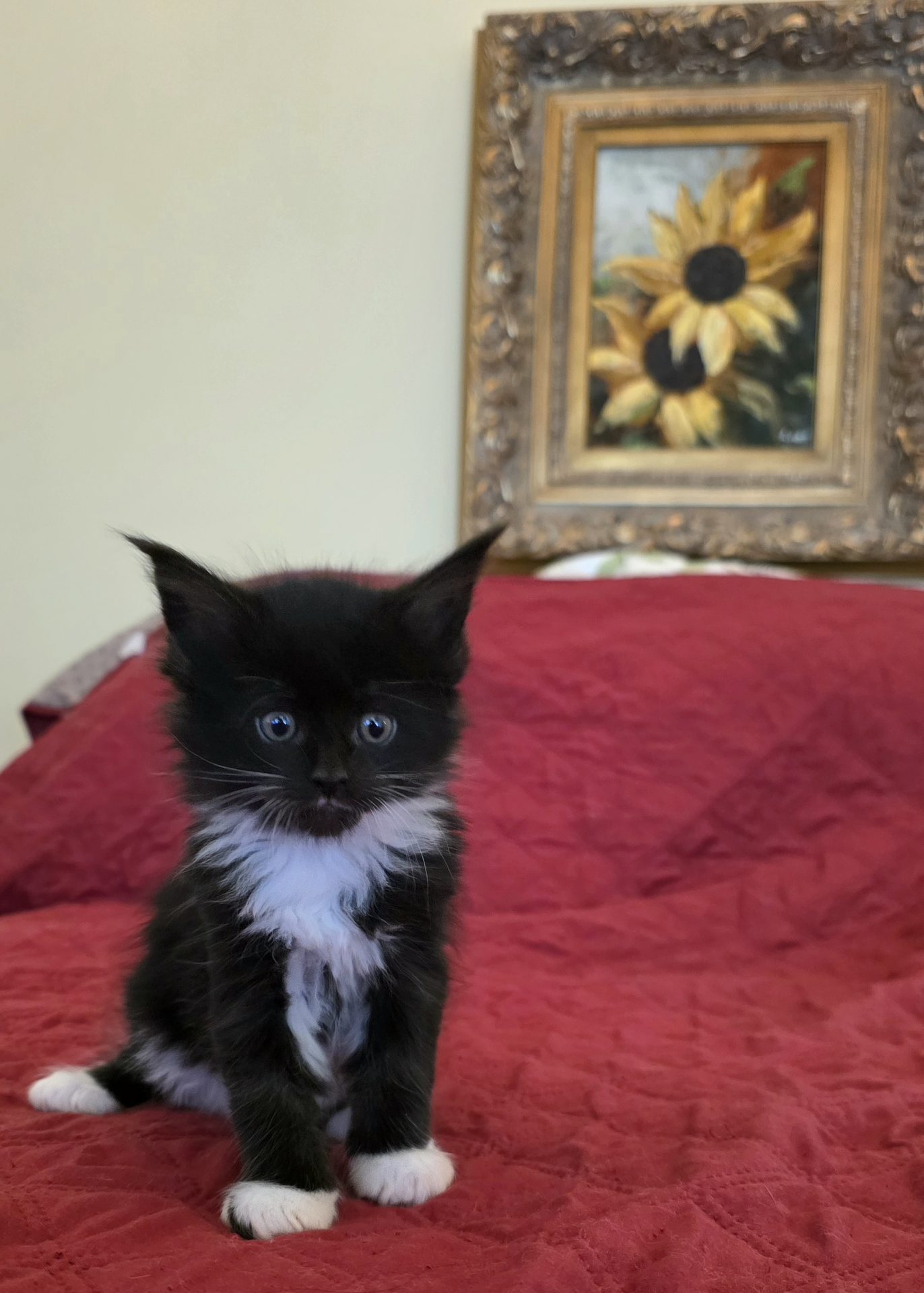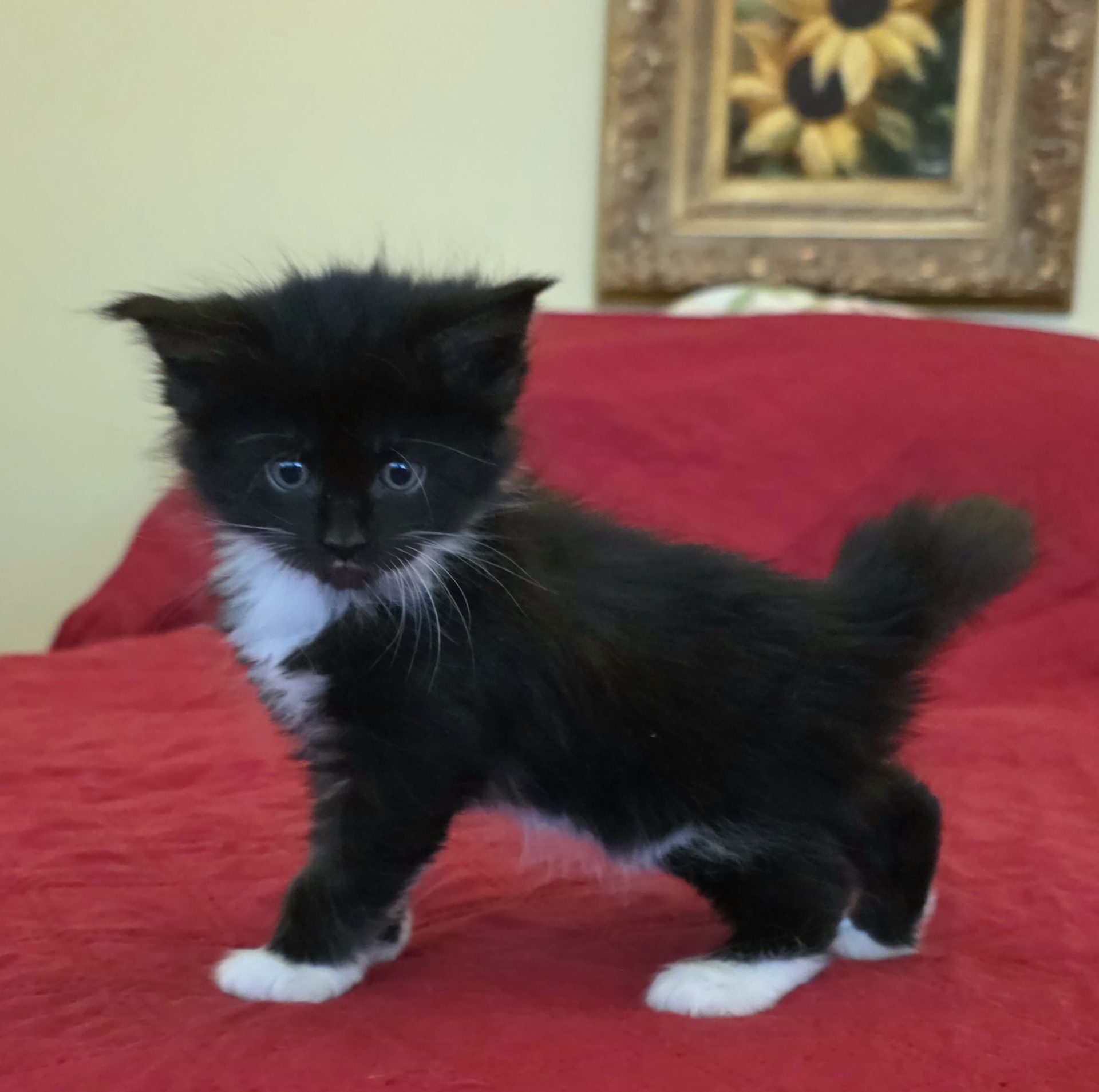 On Hold BETH TAYLOR OF COLUMBUS, GEORGIA WILL HAVE THIS NEW KITTEN FOR THE HOLIDAYS!!!! I originally called this one Button. Why? Well, because she is cute as a button, of course! But Beth chose Katherine the Great, and that is even better! Kate is elegant in her black tux, and her subtle white lipstick and her matching long white whiskers really provide the perfect accents. Add the white gloves and this little Cinderella is all dressed up for the ball! And just wait until her white Elizabethan collar comes out in all its glory! Kate has a demure sweetness mixed with a playful flirtaciousness, and the combination is simply divine! These will be holidays to remember for Beth, I assure you!