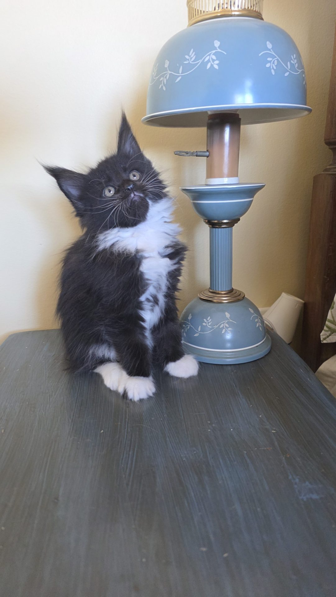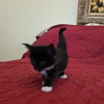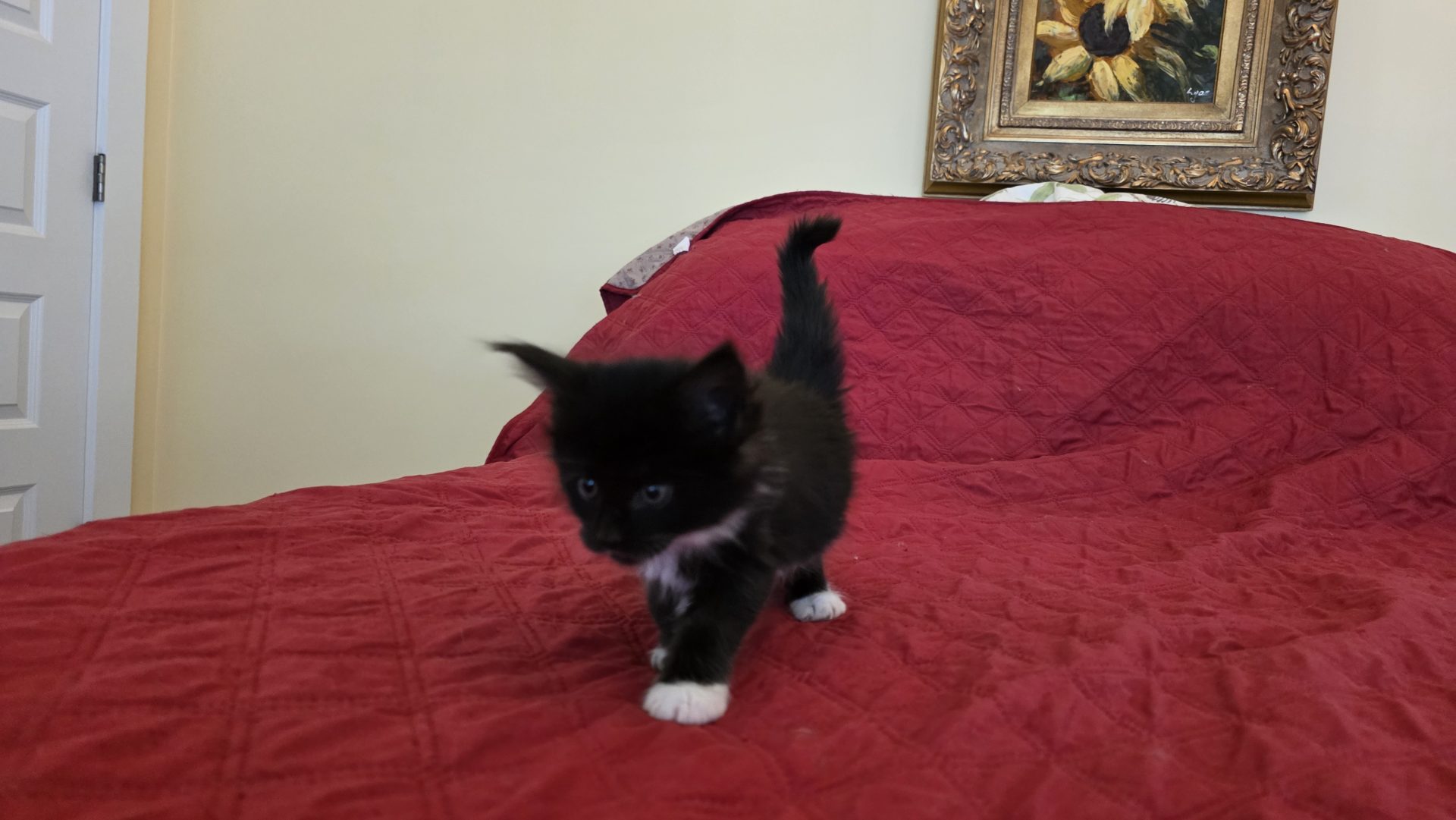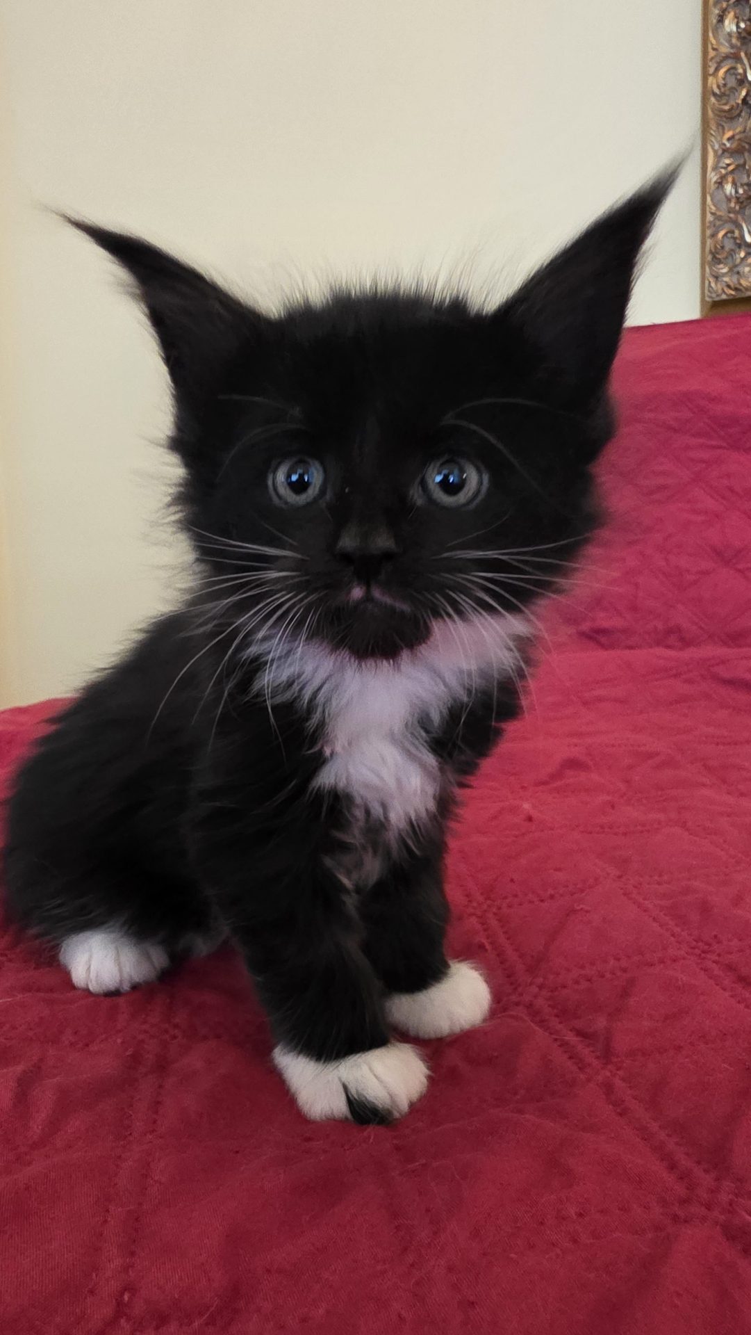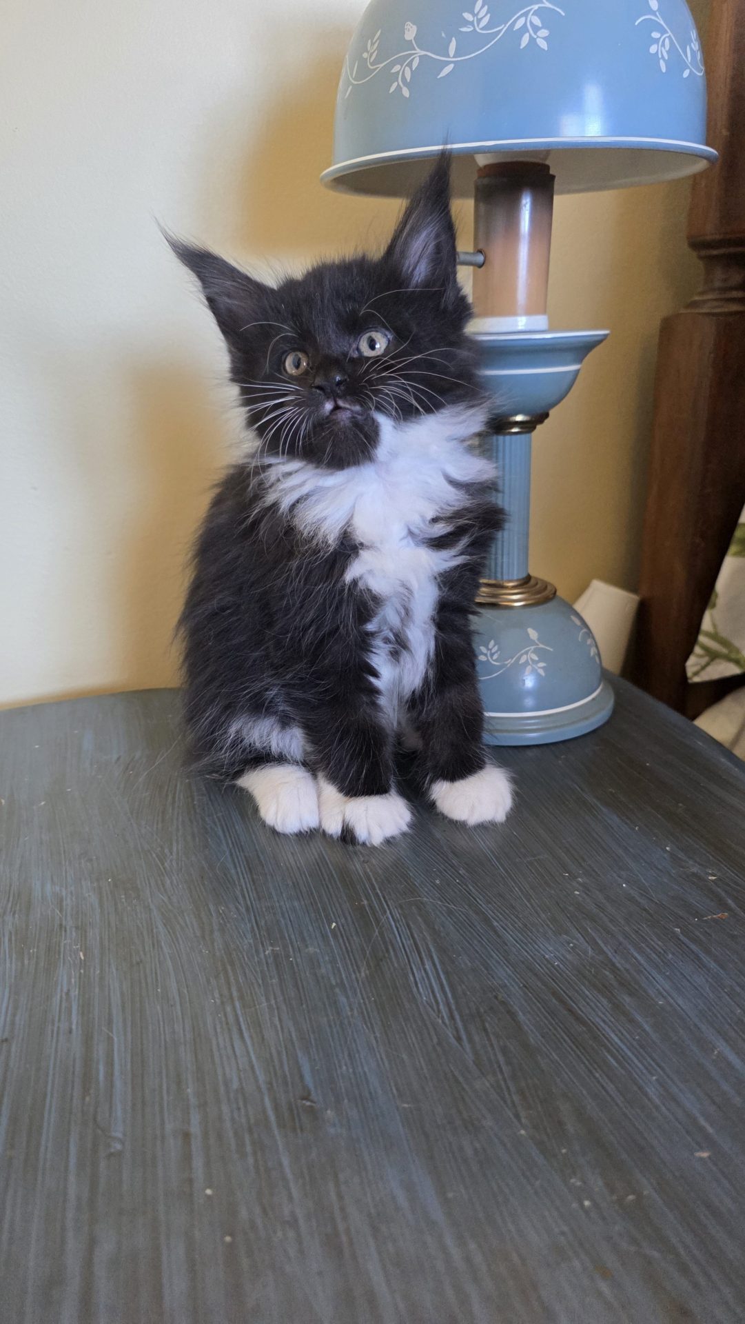 On Hold BETH TAYLOR OF COLUMBUS, GEORGIA WILL HAVE THIS NEW KITTEN FOR THE HOLIDAYS!!!! I originally called this one Button. Why? Well, because she is cute as a button, of course! But Beth chose Katherine the Great, and that is even better! Kate is elegant in her black tux, and her subtle white lipstick and her matching long white whiskers really provide the perfect accents. Add the white gloves and this little Cinderella is all dressed up for the ball! And just wait until her white Elizabethan collar comes out in all its glory! Kate has a demure sweetness mixed with a playful flirtaciousness, and the combination is simply divine! These will be holidays to remember for Beth, I assure you!
