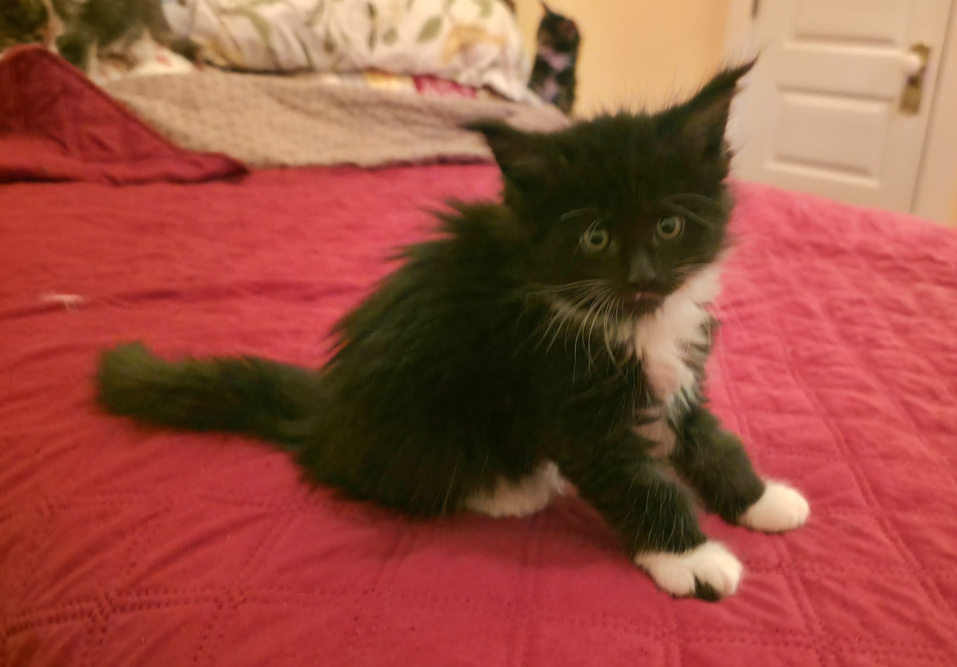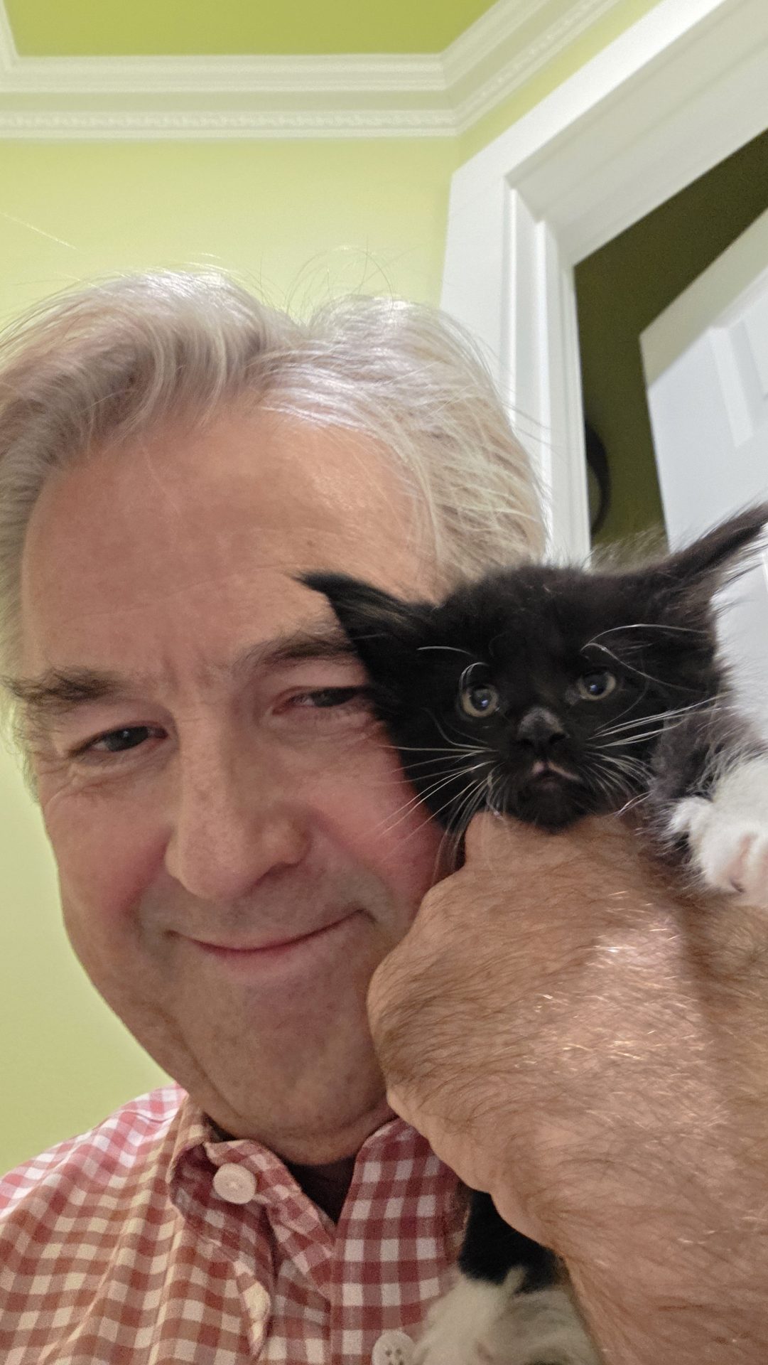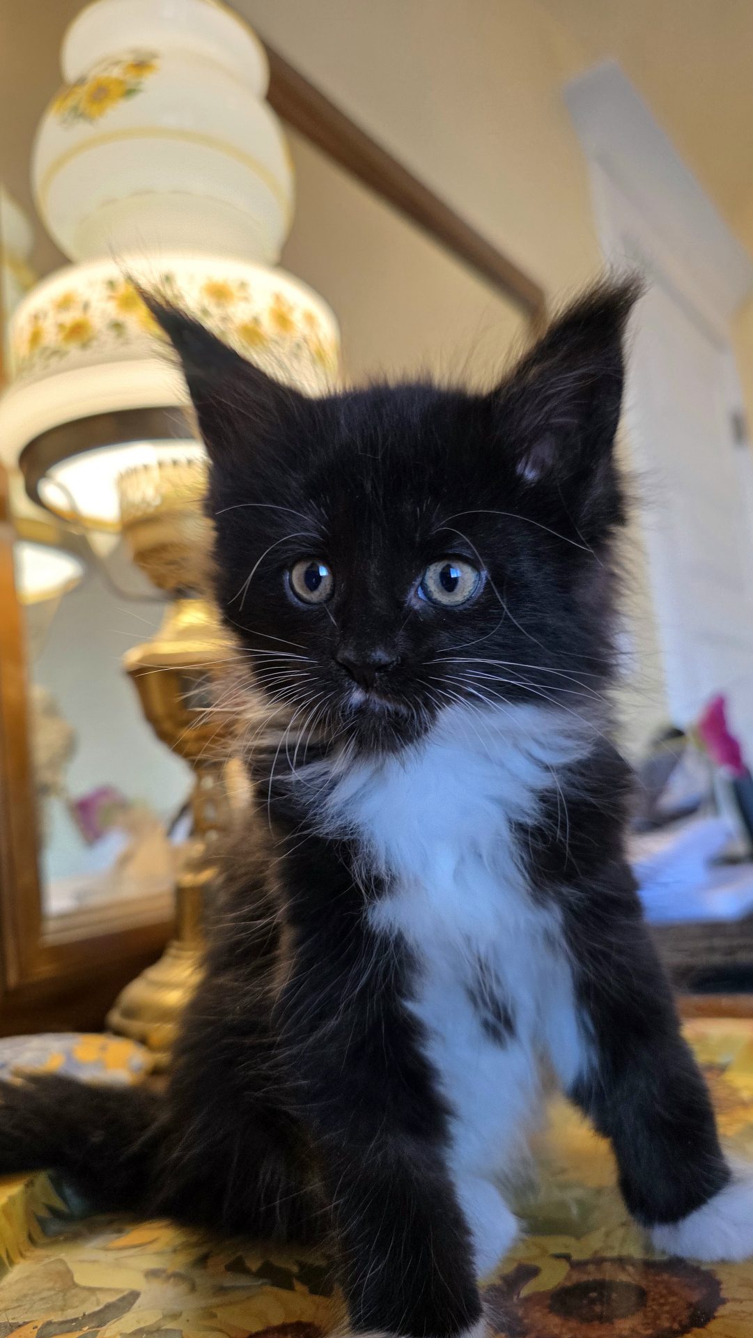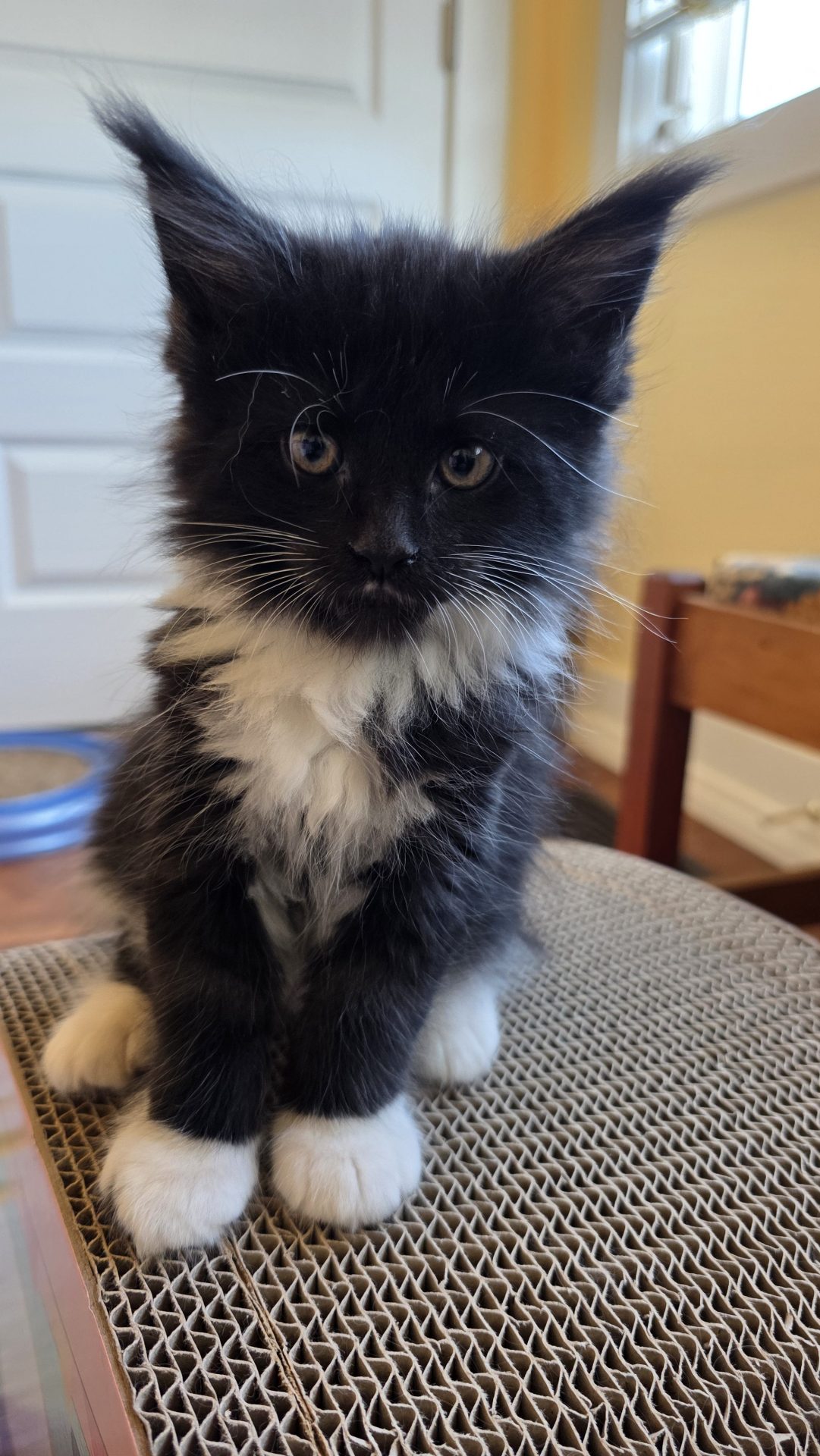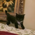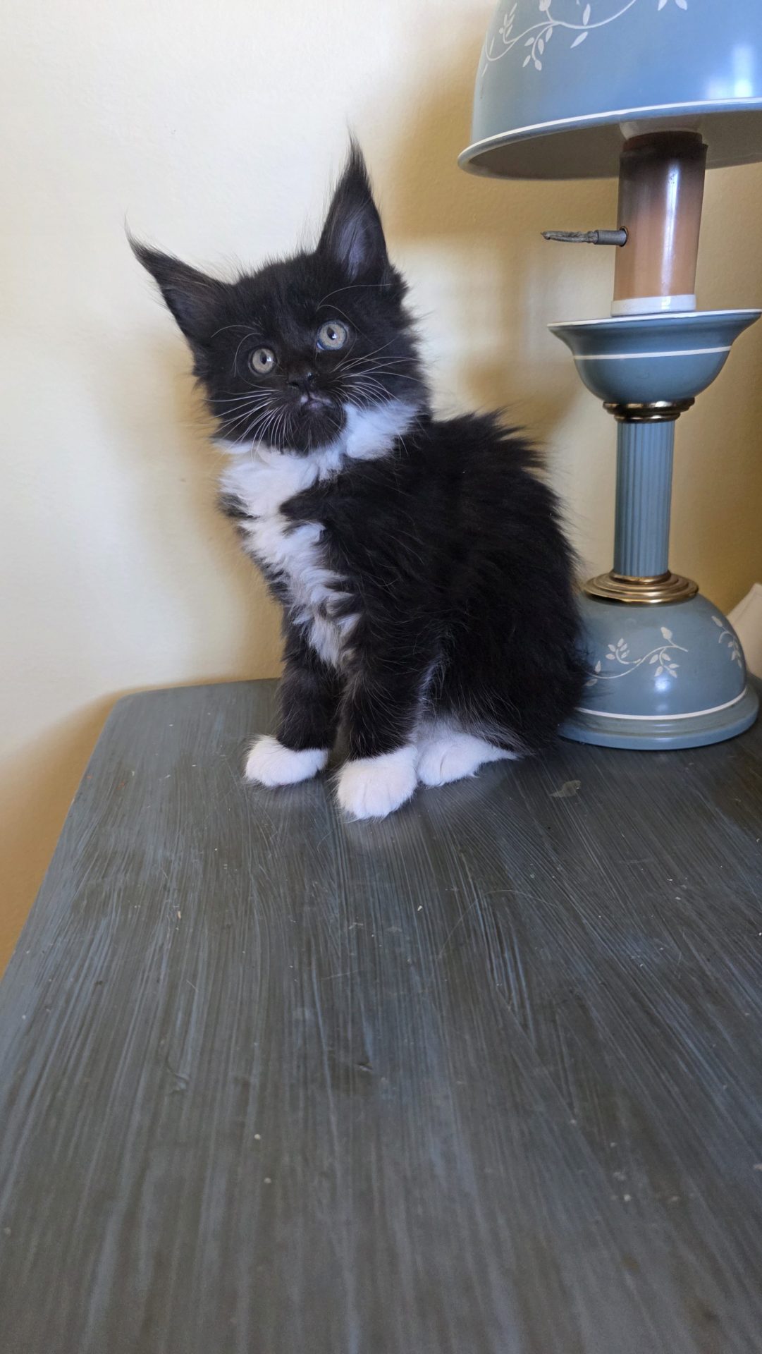 On Hold BETH TAYLOR OF COLUMBUS, GEORGIA WILL HAVE THIS NEW KITTEN FOR THE HOLIDAYS!!!! I originally called this one Button. Why? Well, because she is cute as a button, of course! But Beth chose Katherine the Great, and that is even better! Kate is elegant in her black tux, and her subtle white lipstick and her matching long white whiskers really provide the perfect accents. Add the white gloves and this little Cinderella is all dressed up for the ball! And just wait until her white Elizabethan collar comes out in all its glory! Kate has a demure sweetness mixed with a playful flirtaciousness, and the combination is simply divine! These will be holidays to remember for Beth, I assure you!