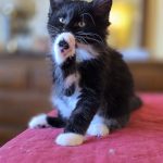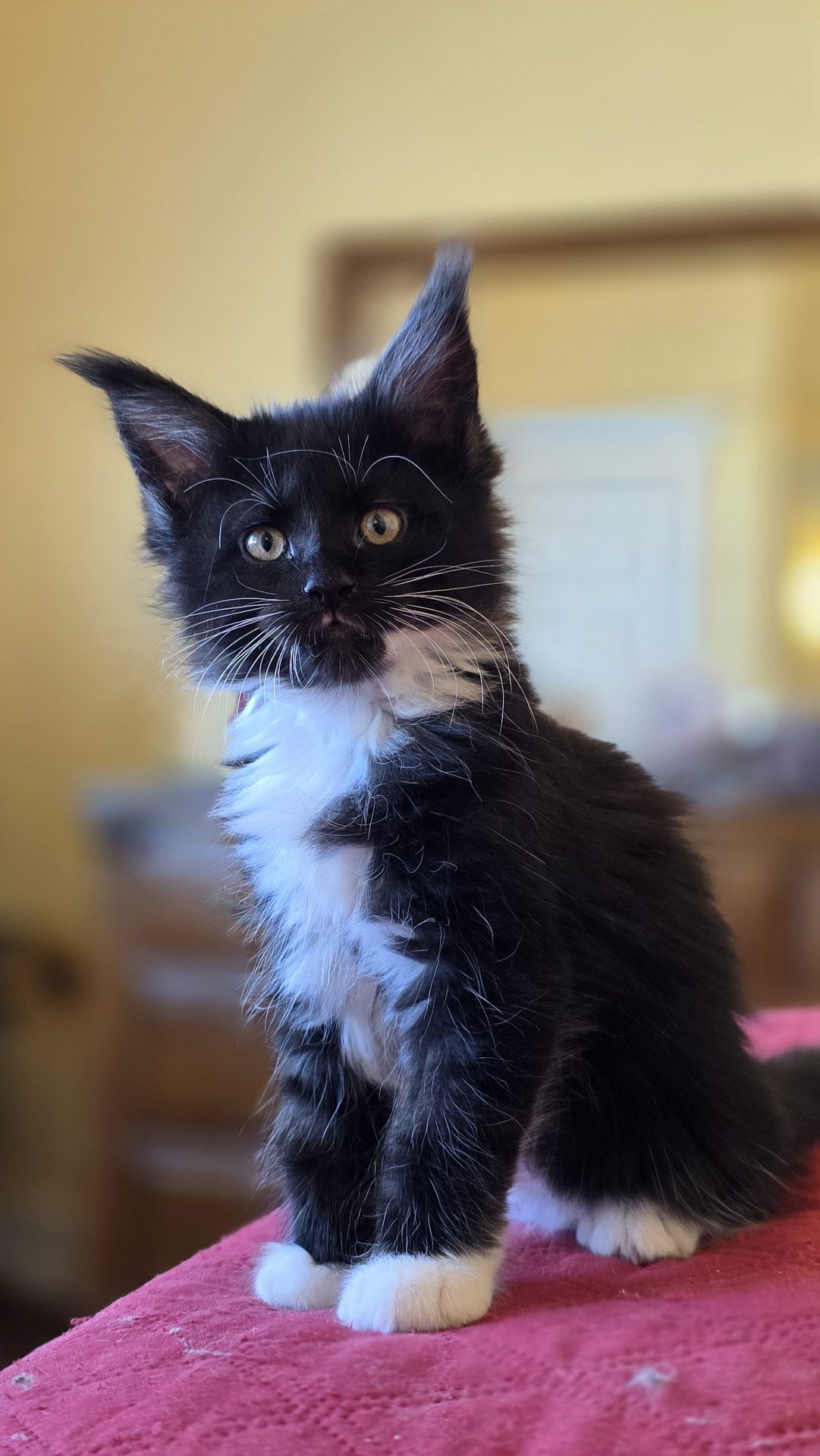 Sold BETH TAYLOR OF COLUMBUS, GEORGIA WILL HAVE THIS NEW KITTEN FOR THE HOLIDAYS!!!! I originally called this one Button. Why? Well, because she is cute as a button, of course! But Beth chose Katherine the Great, and that is even better! Kate is elegant in her black tux, and her subtle white lipstick and her matching long white whiskers really provide the perfect accents. Add the white gloves and this little Cinderella is all dressed up for the ball! And just wait until her white Elizabethan collar comes out in all its glory! Kate has a demure sweetness mixed with a playful flirtaciousness, and the combination is simply divine! These will be holidays to remember for Beth, I assure you!