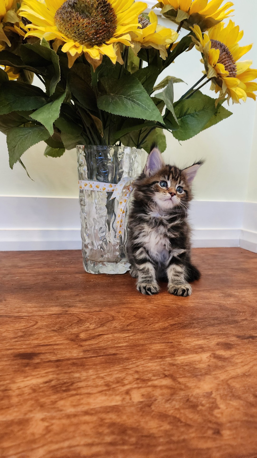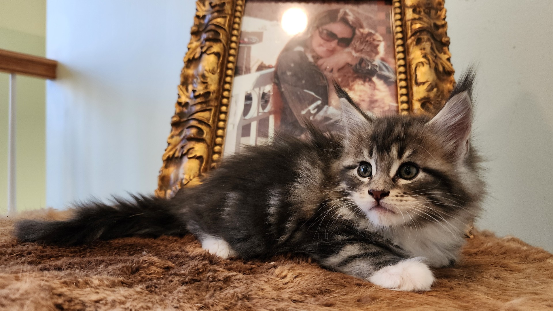 Sold GOING NORTH TO THE WONDERFUL PATENAUDE FAMILY IN QUEBEC!!! Hiawatha is a gorgeous classic Maine Coon. This is the original Maine Coon look-- the look that led European settlers to believe that these big Maine forest cats were a cross between a wild cat and a racoon--"Maine Coons." Nothing wild about Hiawatha, though. She is a happy-go-lucky girl who loves to play and loves to snuggle. Her ear tips are starting to come on strong and are growing every day. Hiawatha gives the boys all they can handle in their daily wrestling matches. I just love her markings and her classic Maine Coon beauty! Her new family named her Szyszka, pronounced "Shishka," which is Polish for "Pine Cone."