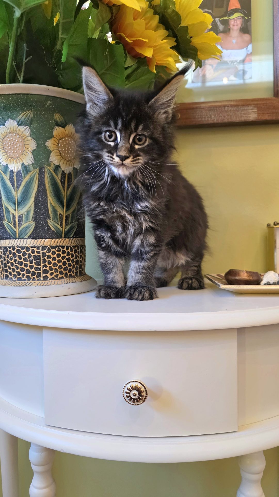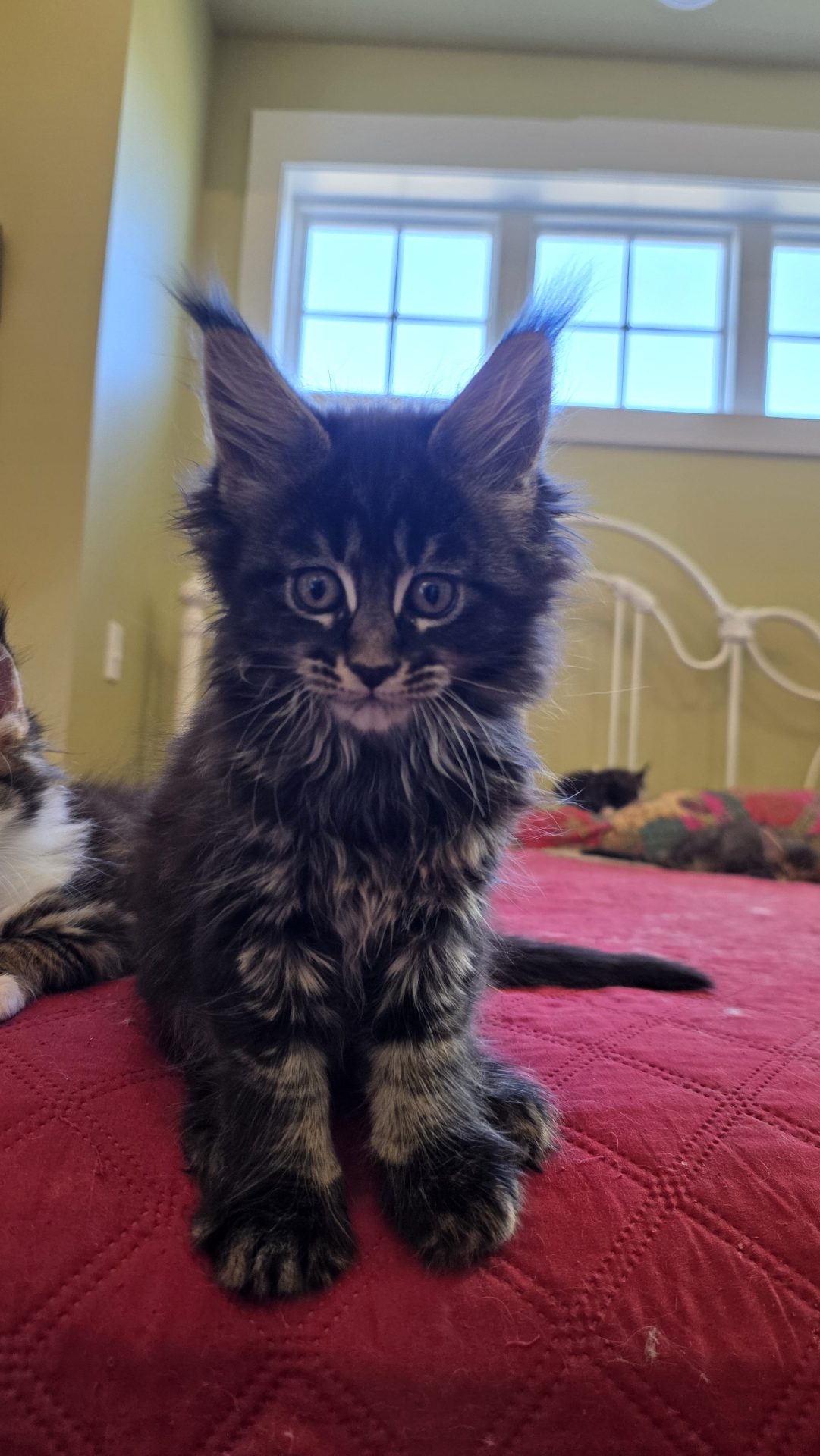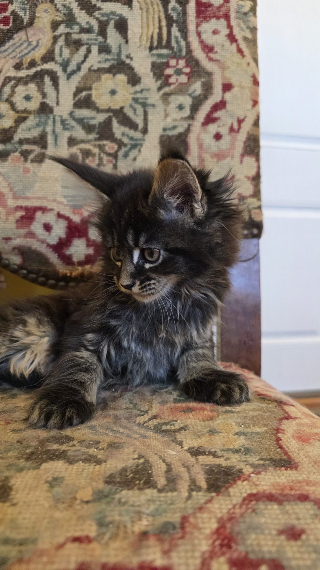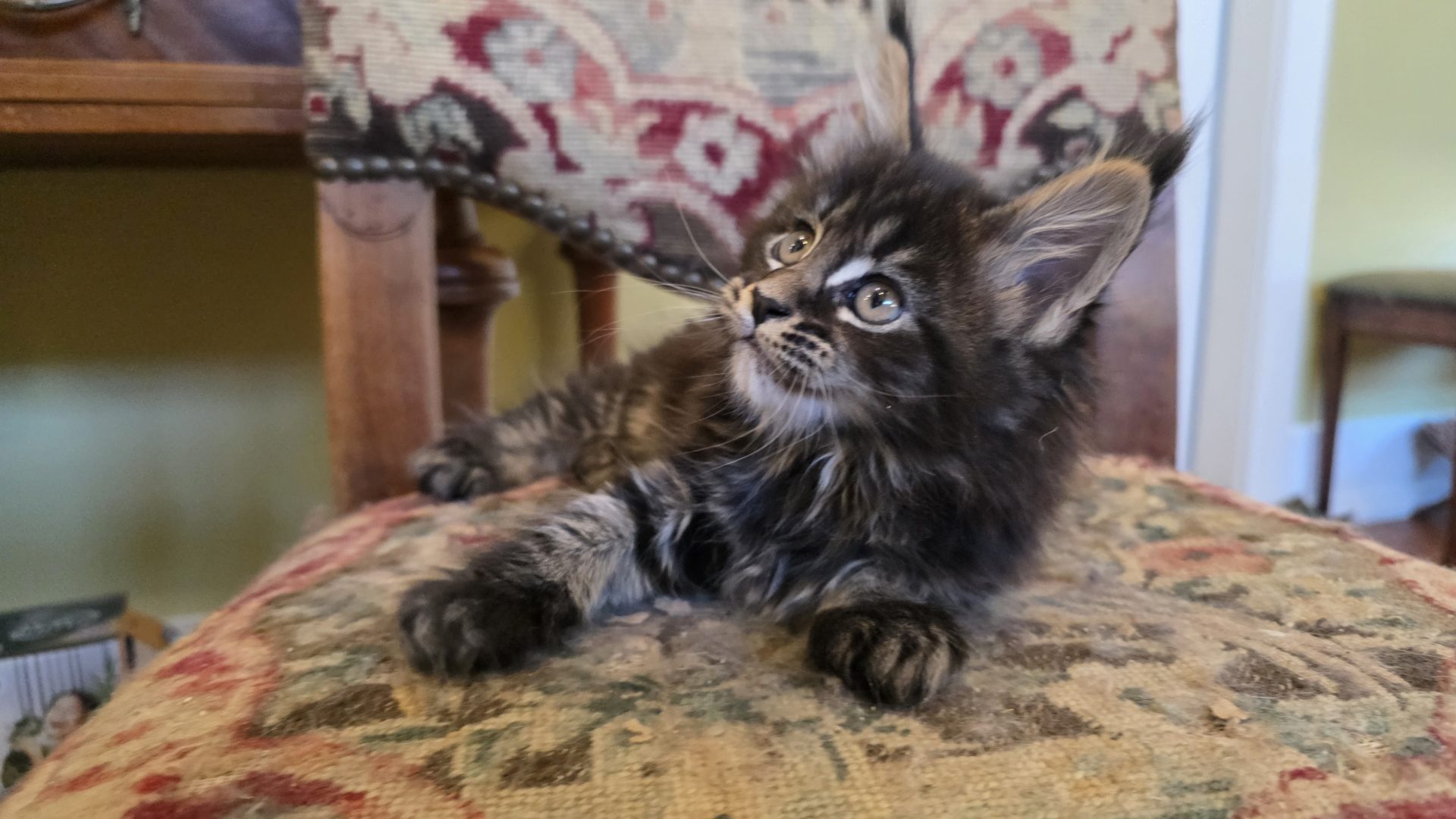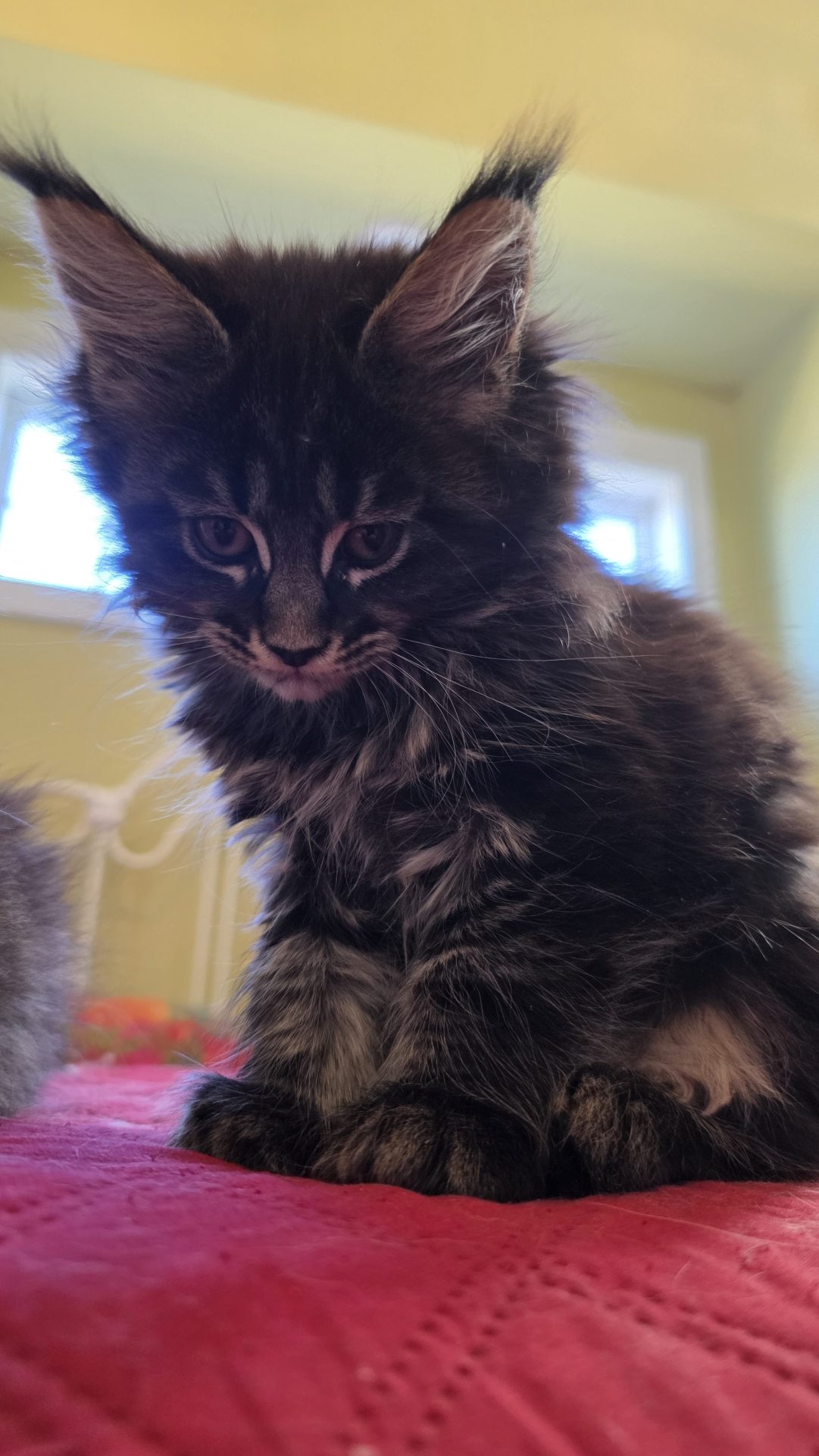 Available - $4000 THE BIGGEST AND FLUFFIEST KITTEN IN HER LITTER!!! Misty is super friendly, super playful, and perfectly willing to curl up in the bed with you on a cold winter's night! She has a childlike happy and trusting spirit, and boundless curiosity. She loves to play with cat toys and with her littermates, but there is no doubt that humans are her favorite playthings. This dark, sultry Classic Tabby is going to have a huge mane, big ear tips, and massive furry paws that will make quite a muffled rumble on a hardwood floor! And her magnificent coat is going to be long, thick and the envy of any mink! Misty is a one of a kind kitten and will be ready to go home January 15.