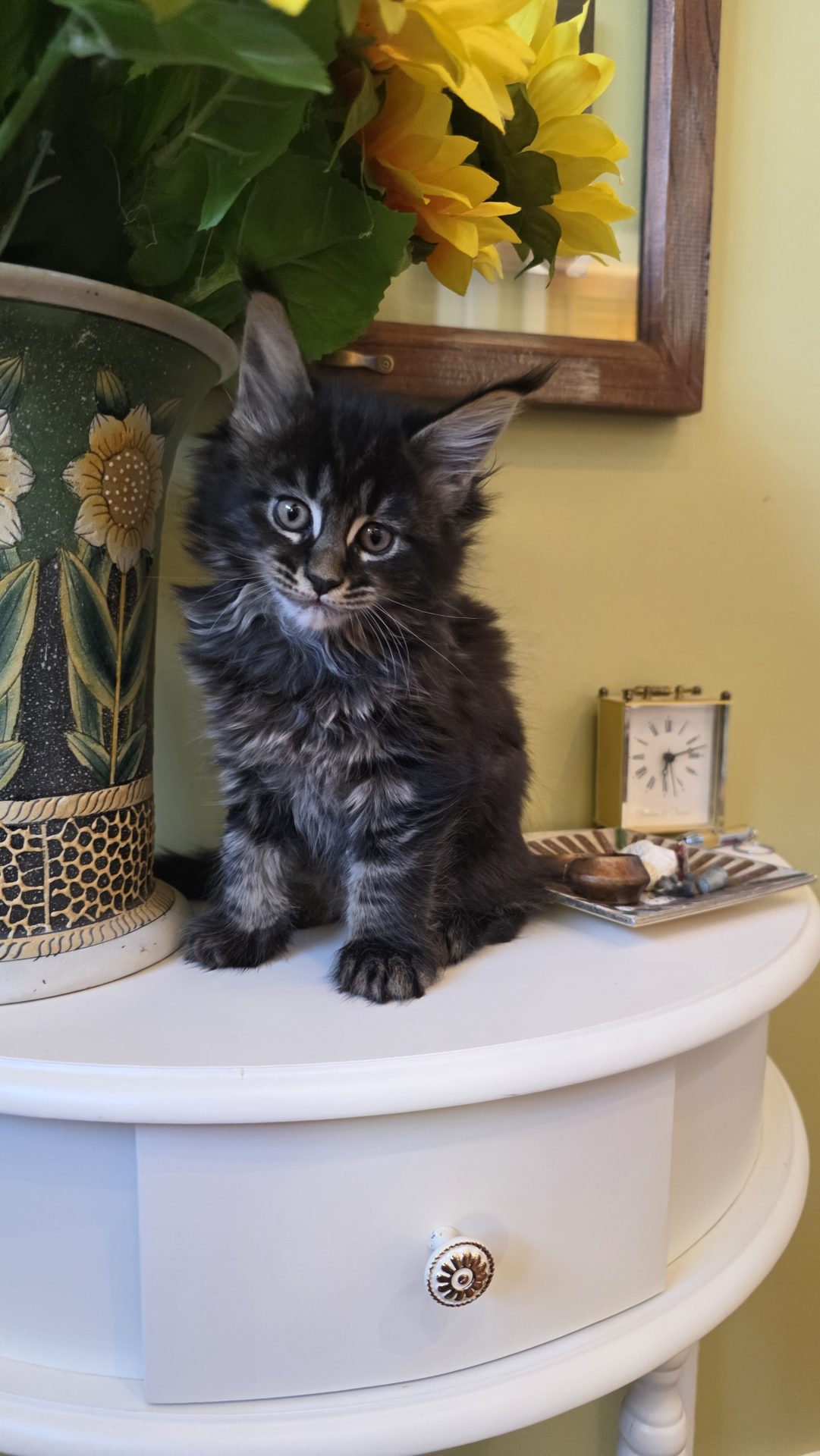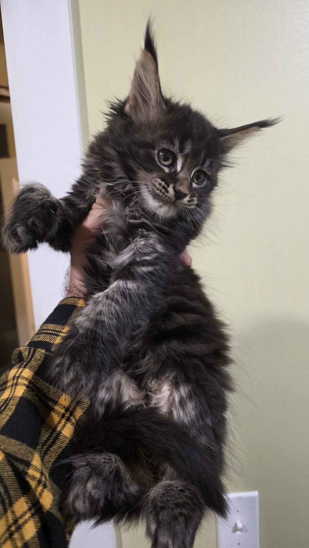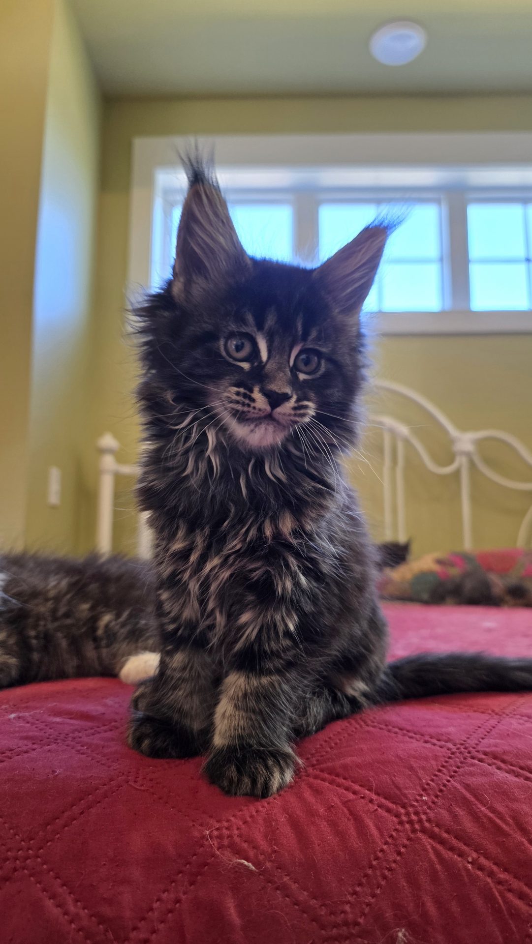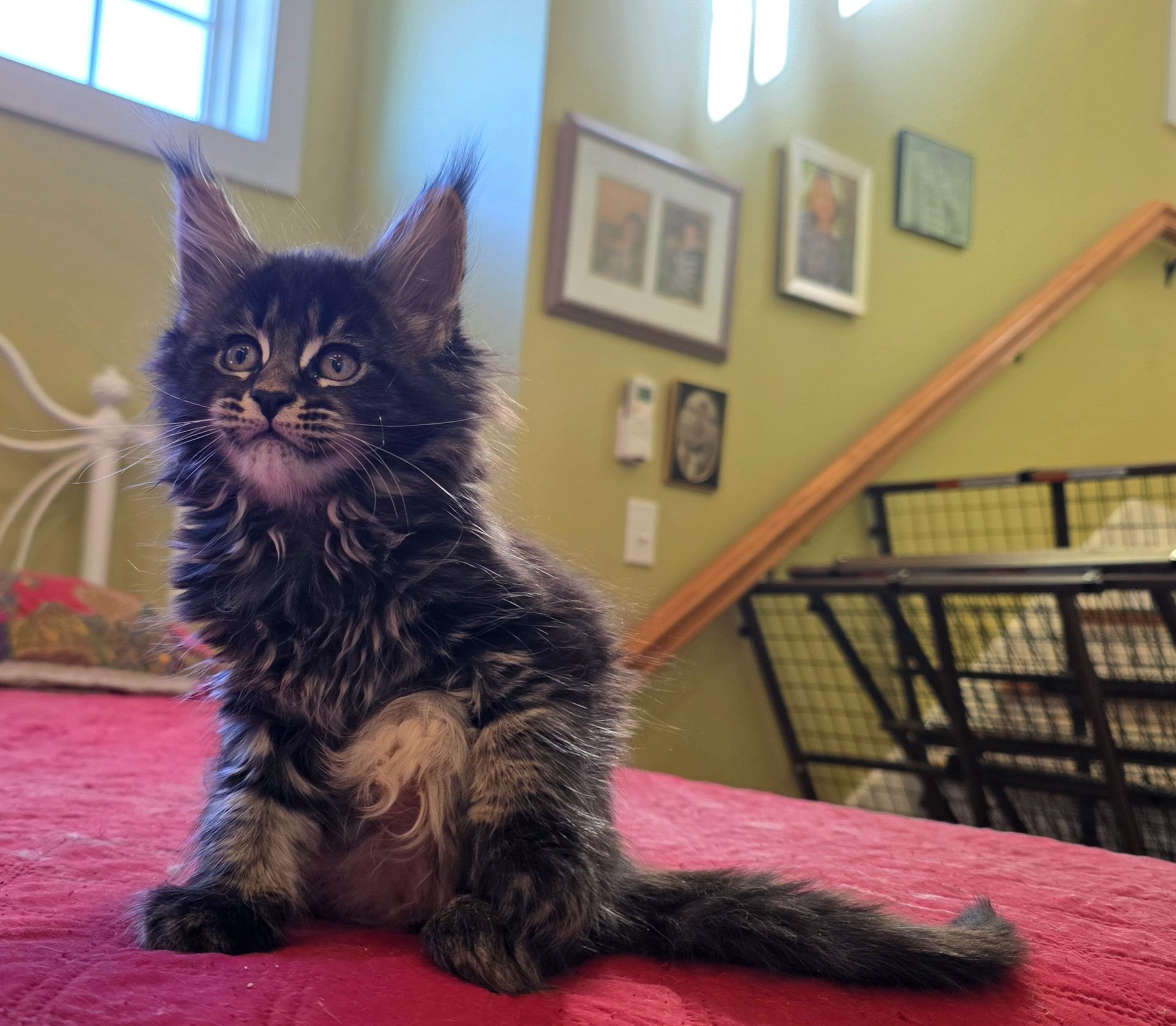 Available - $4000 THE BIGGEST AND FLUFFIEST KITTEN IN HER LITTER!!! Misty is super friendly, super playful, and perfectly willing to curl up in the bed with you on a cold winter's night! She has a childlike happy and trusting spirit, and boundless curiosity. She loves to play with cat toys and with her littermates, but there is no doubt that humans are her favorite playthings. This dark, sultry Classic Tabby is going to have a huge mane, big ear tips, and massive furry paws that will make quite a muffled rumble on a hardwood floor! And her magnificent coat is going to be long, thick and the envy of any mink! Misty is a one of a kind kitten and will be ready to go home January 15.