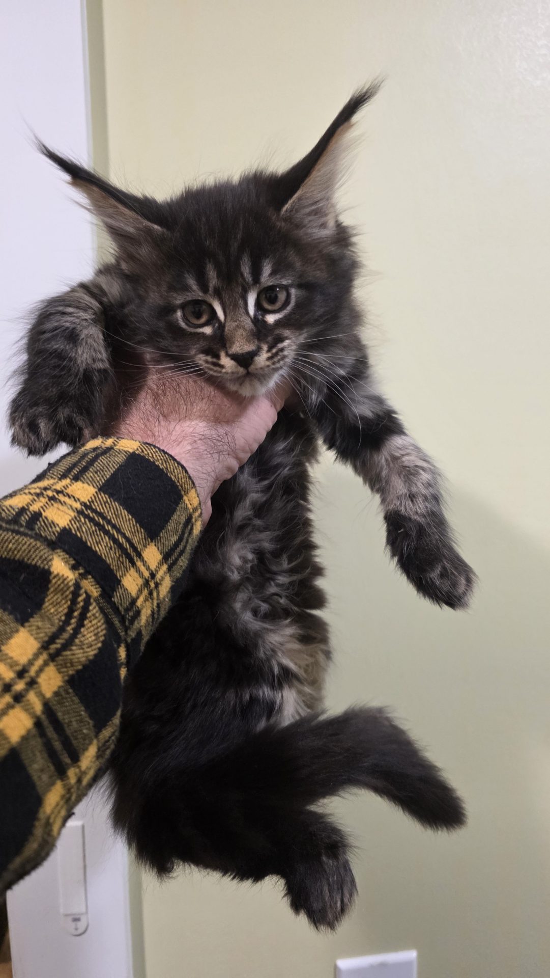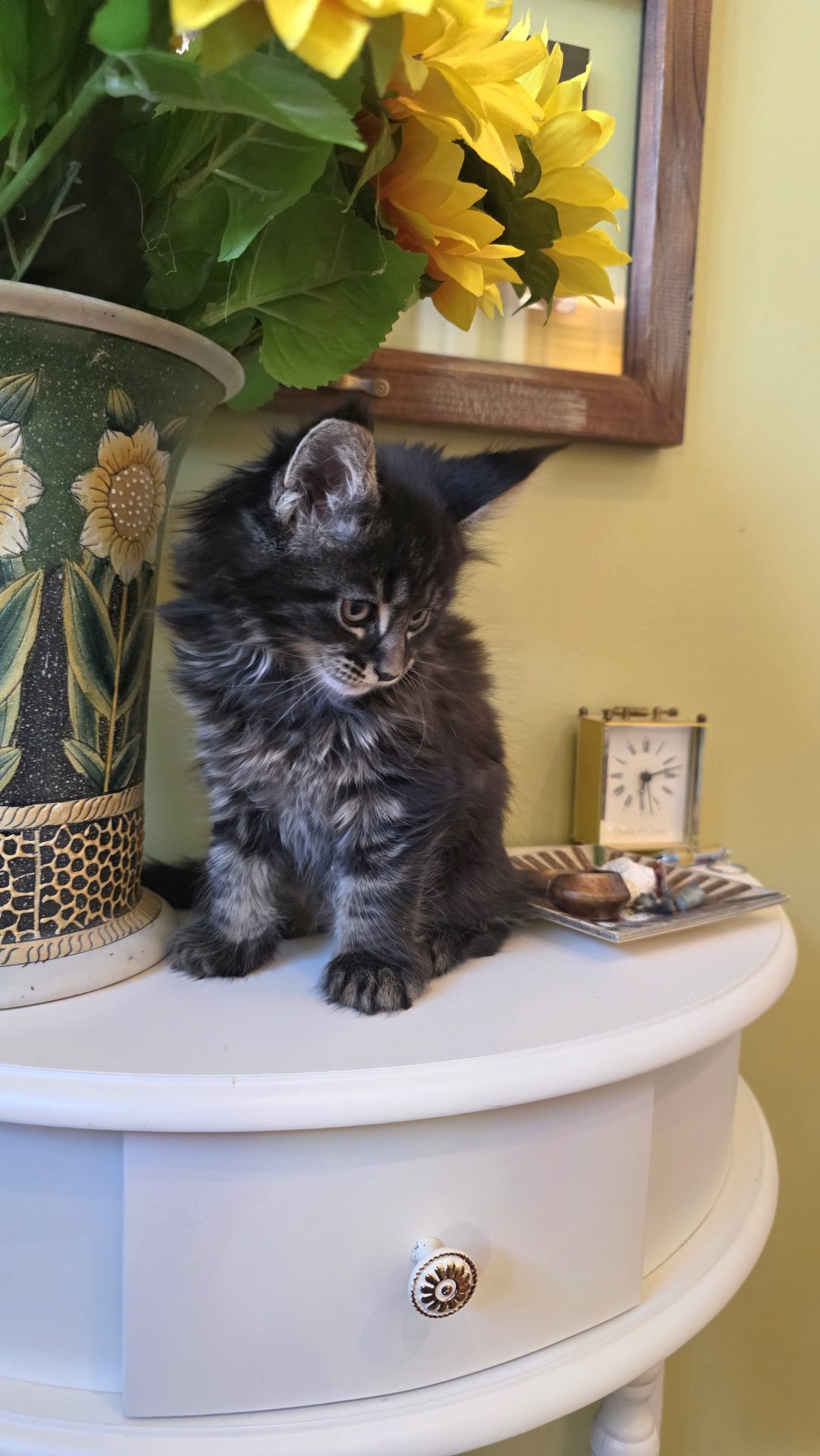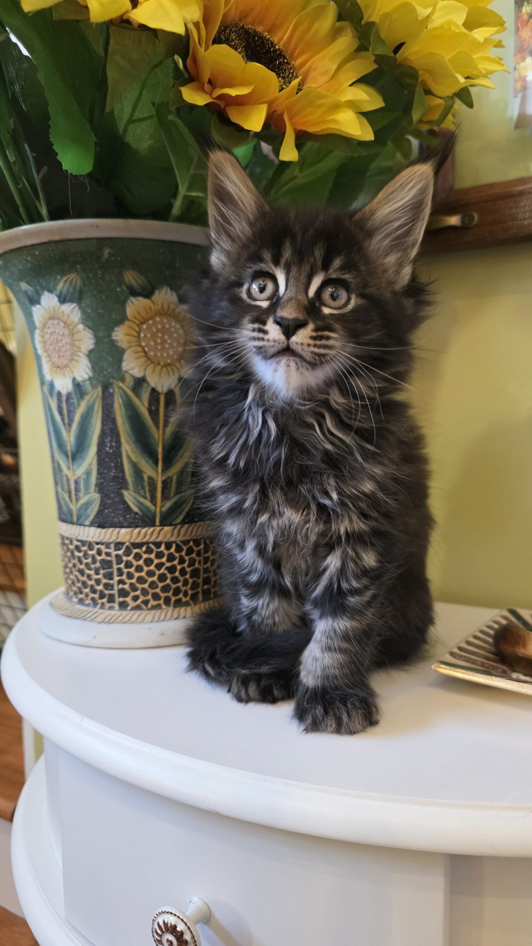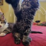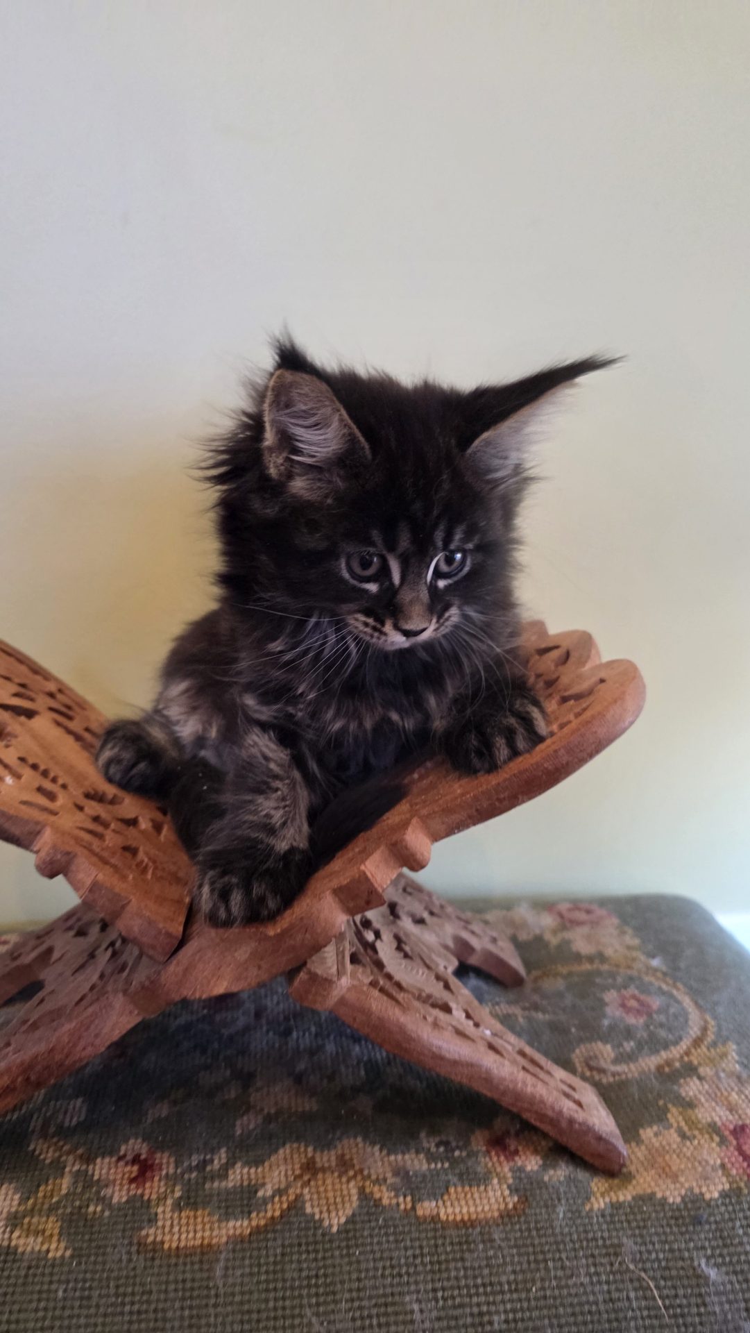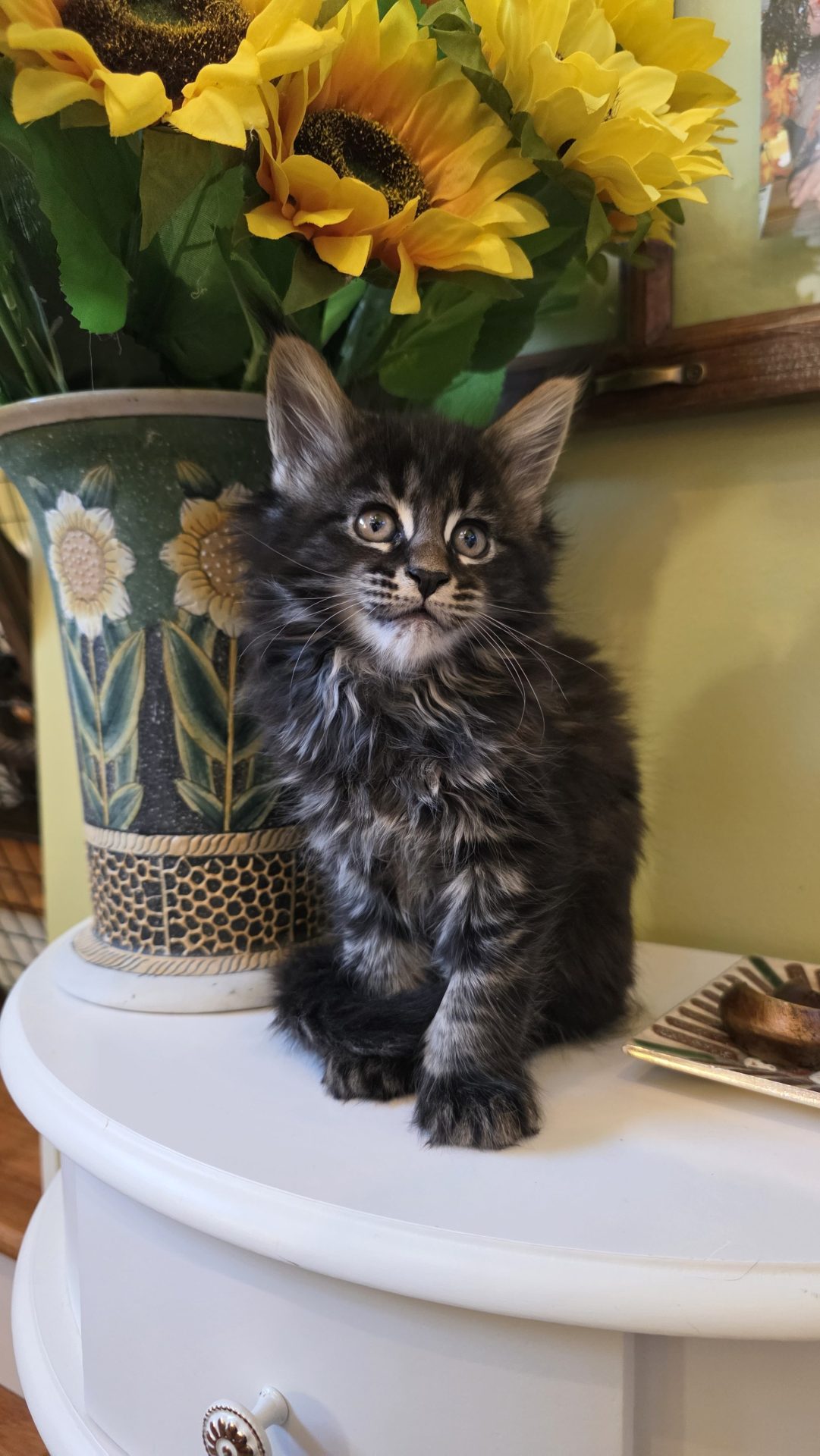 Available - $4000 THE BIGGEST AND FLUFFIEST KITTEN IN HER LITTER!!! Misty is super friendly, super playful, and perfectly willing to curl up in the bed with you on a cold winter's night! She has a childlike happy and trusting spirit, and boundless curiosity. She loves to play with cat toys and with her littermates, but there is no doubt that humans are her favorite playthings. This dark, sultry Classic Tabby is going to have a huge mane, big ear tips, and massive furry paws that will make quite a muffled rumble on a hardwood floor! And her magnificent coat is going to be long, thick and the envy of any mink! Misty is a one of a kind kitten and will be ready to go home January 15.