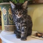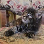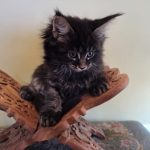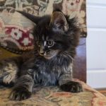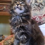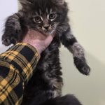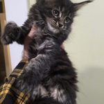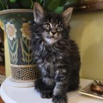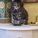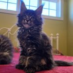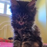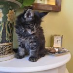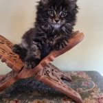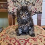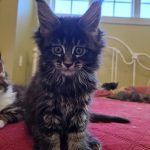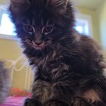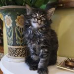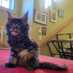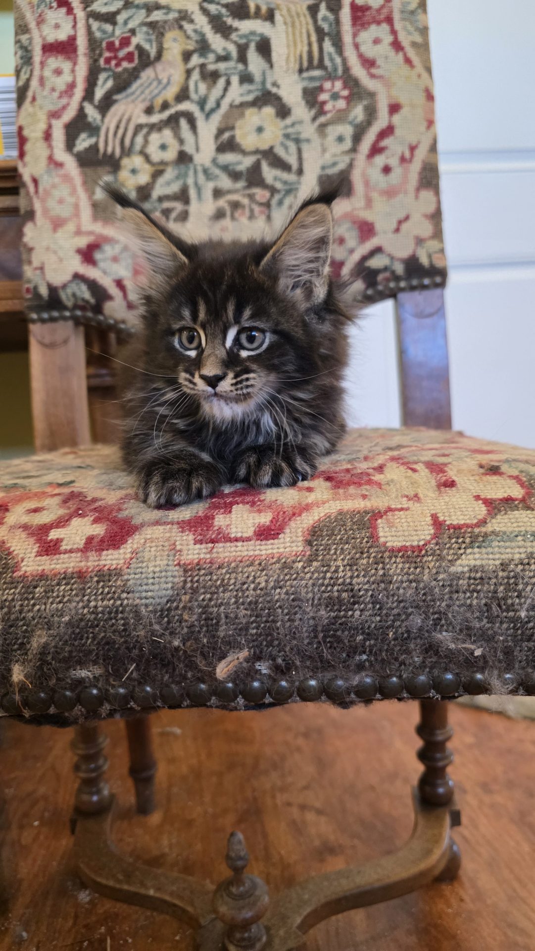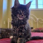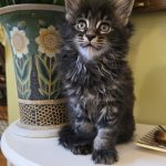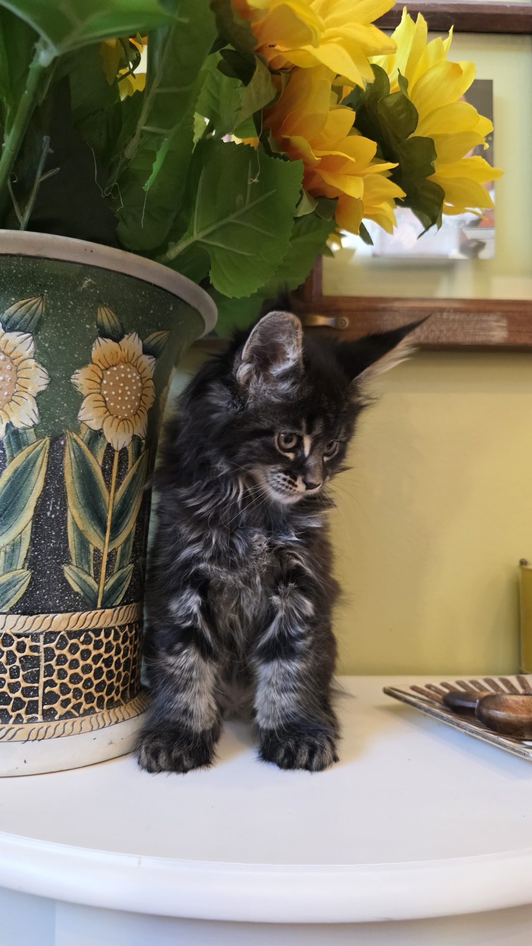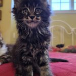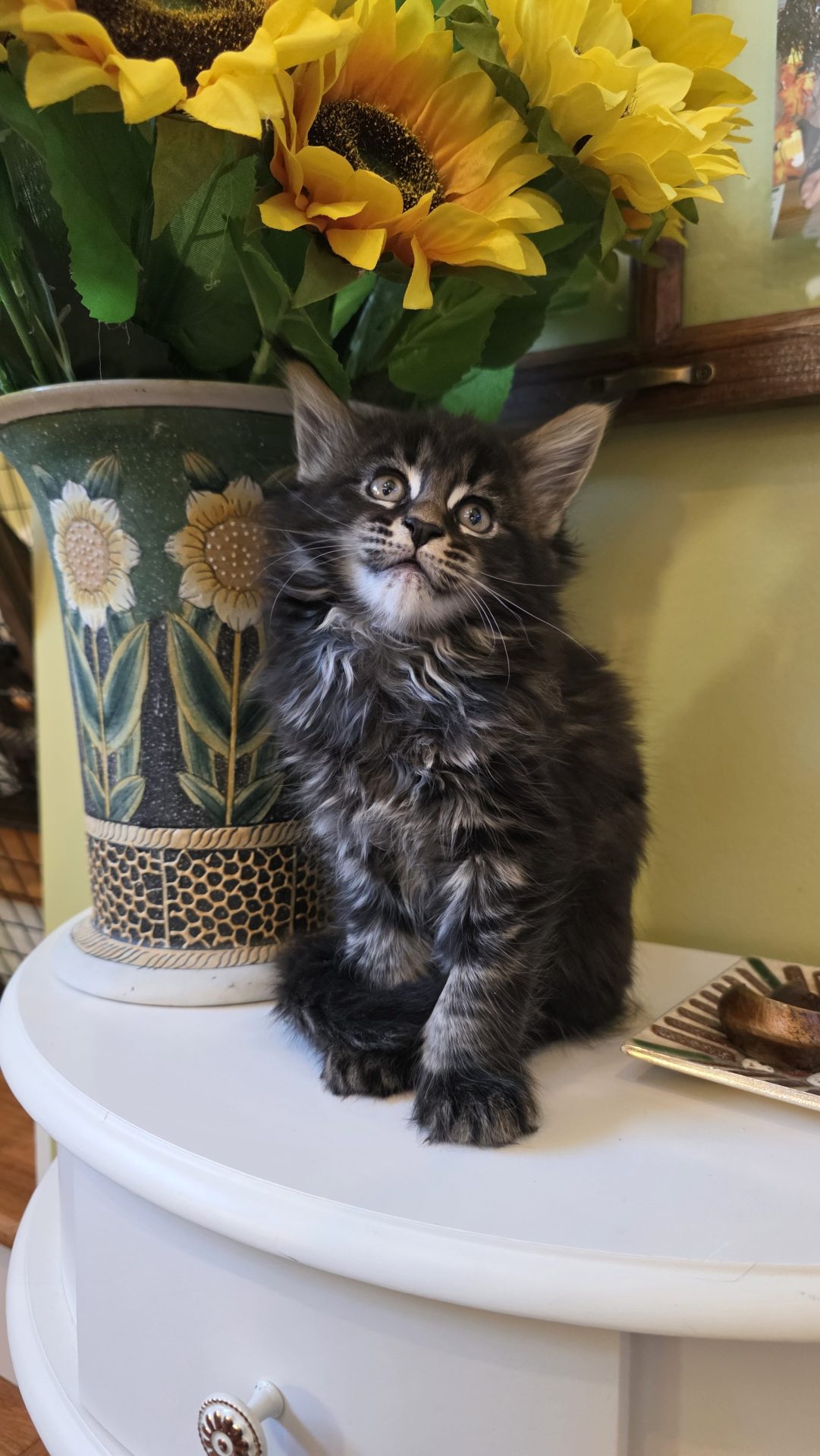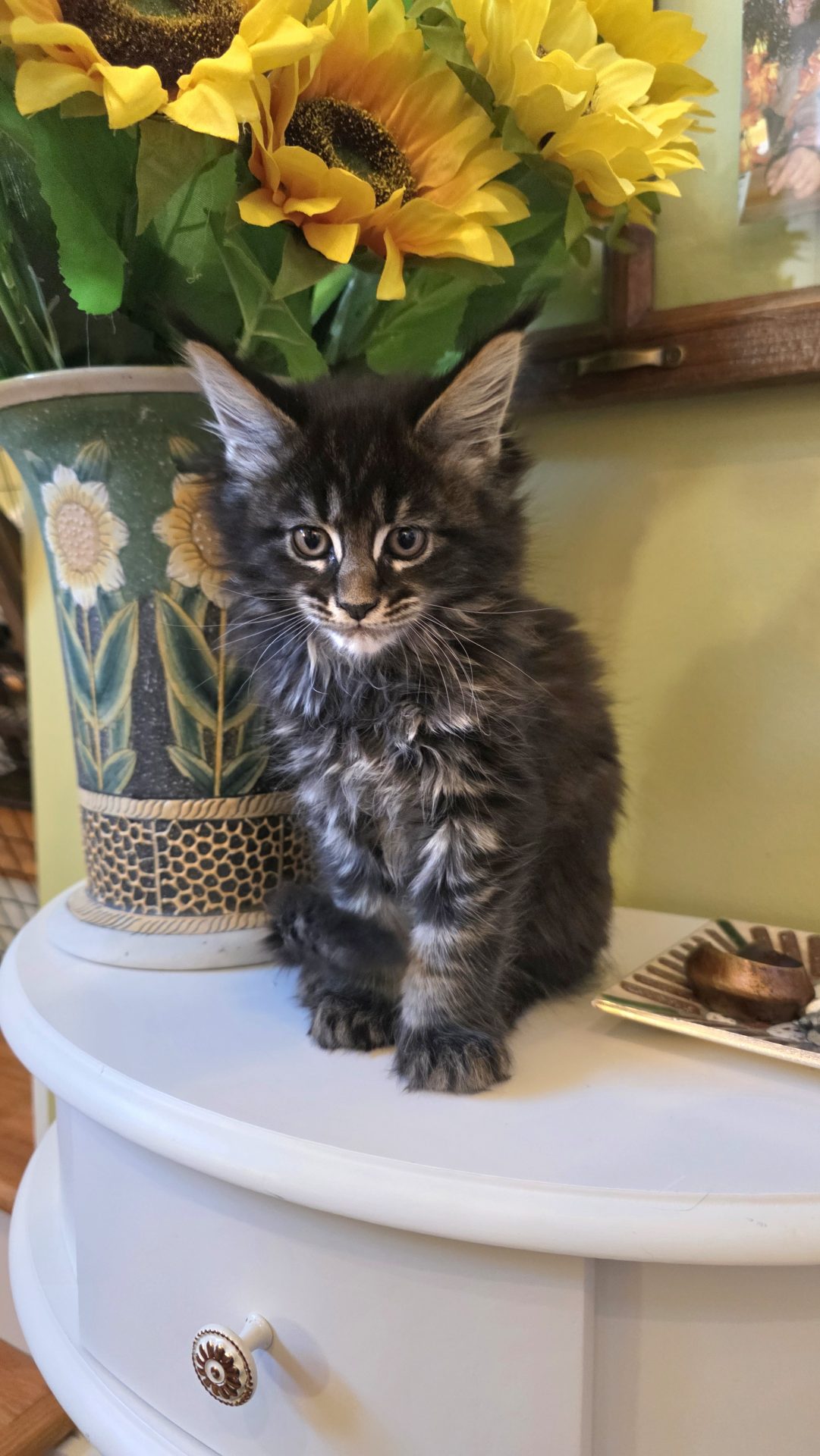 Available - $4000 THE BIGGEST AND FLUFFIEST KITTEN IN HER LITTER!!! Misty is super friendly, super playful, and perfectly willing to curl up in the bed with you on a cold winter's night! She has a childlike happy and trusting spirit, and boundless curiosity. She loves to play with cat toys and with her littermates, but there is no doubt that humans are her favorite playthings. This dark, sultry Classic Tabby is going to have a huge mane, big ear tips, and massive furry paws that will make quite a muffled rumble on a hardwood floor! And her magnificent coat is going to be long, thick and the envy of any mink! Misty is a one of a kind kitten and will be ready to go home January 15.