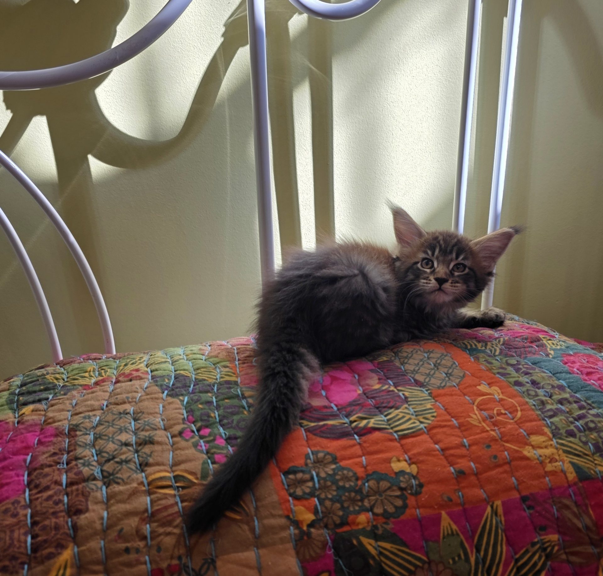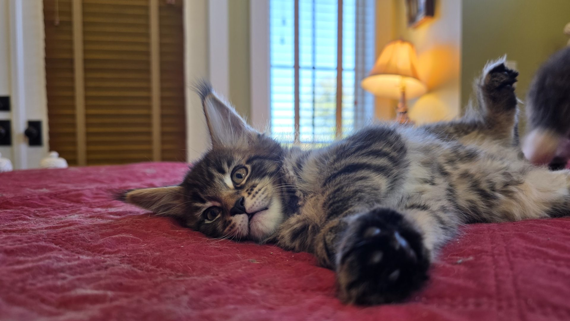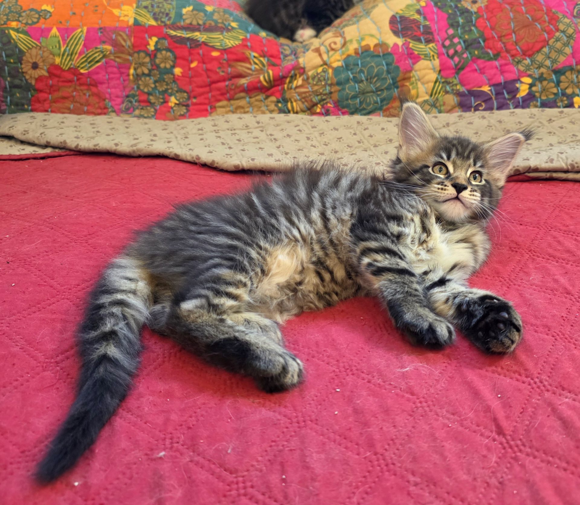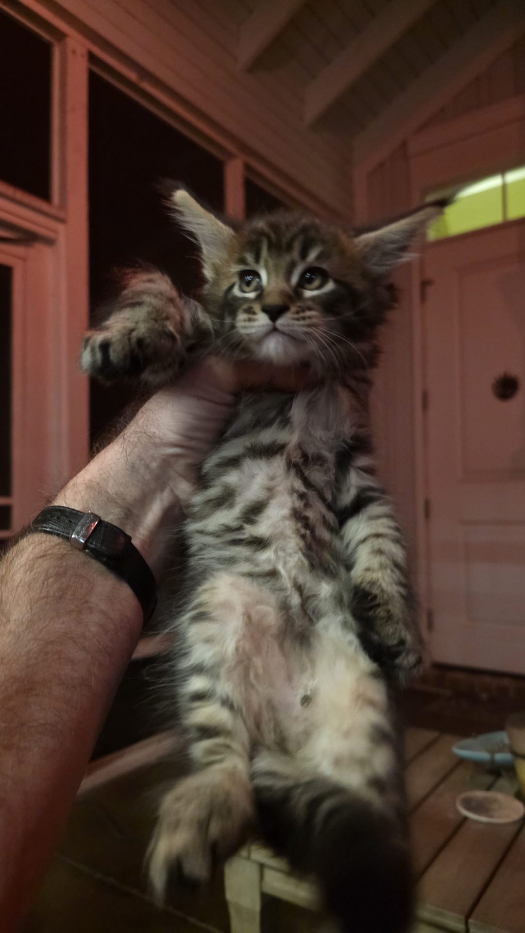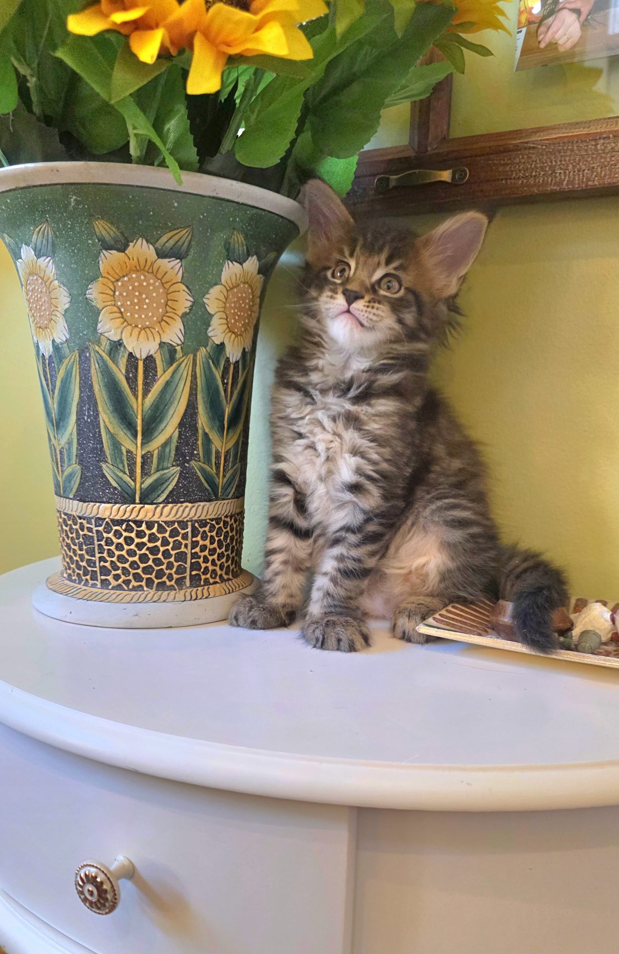Reserved JOINING PAST JELLICO DREAM KITTENS AXEL, BODE, AND TAHOE IN THE WONDERFUL VENTRESCO FAMILY IN BOSTON!!! When I first saw this kitten, her aura brought me visions of a Classic Brown Tabby Maine Coon standing at the edge of the North Woods in the soft moonlight. So I decided to call her Moonlight. I still have that vision in my mind every time I gaze at her. This is a confident gal who holds her own playing with the boys but cuddles better than any of them. She loves belly rubs, loves to ride on my shoulder, and loves to sleep in the crook of my arm when I take a nap with her litter. Her eyes are deep and warm and full of love and fun. If Robert Frost had seen this girl when "Stopping By the Woods on a Snowy Evening," his poem would have turned out quite differently!