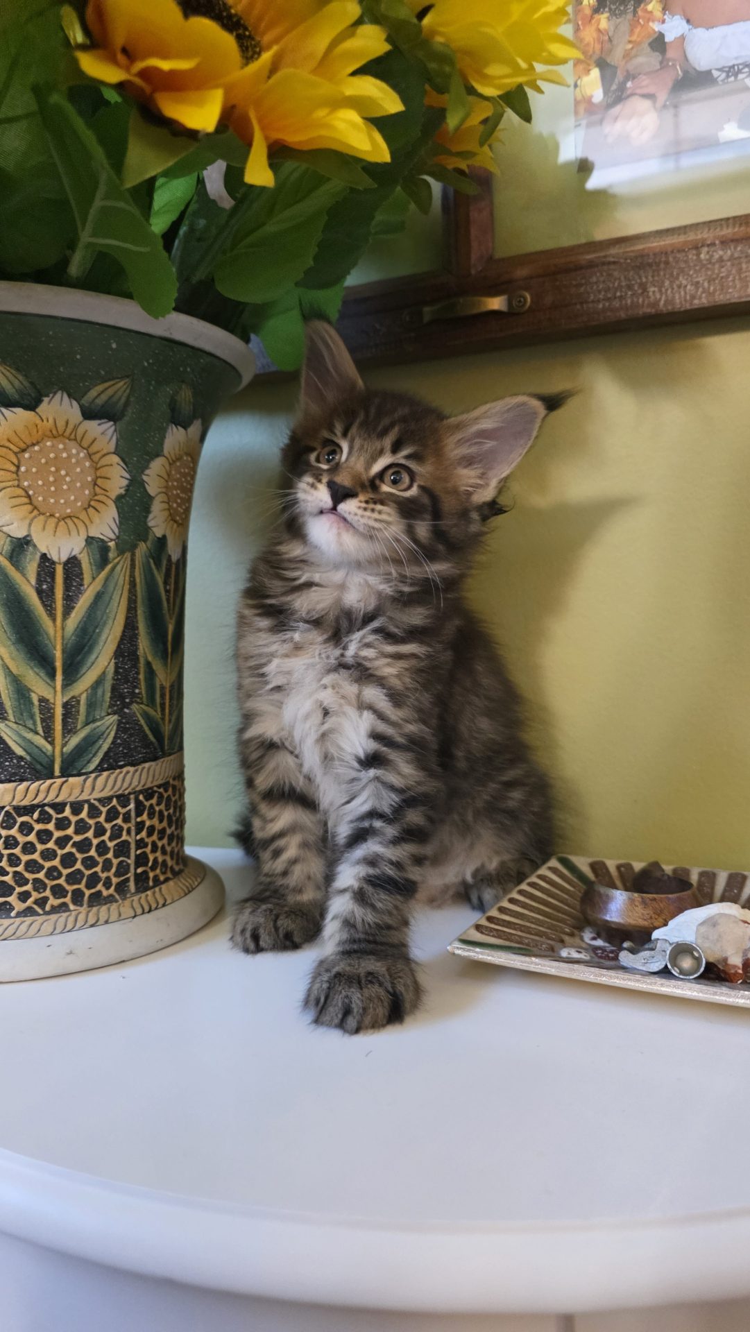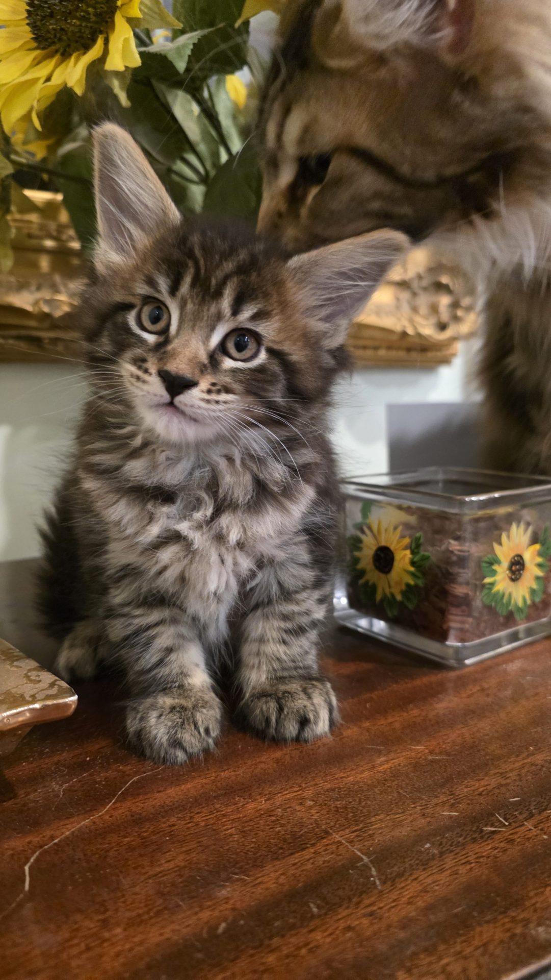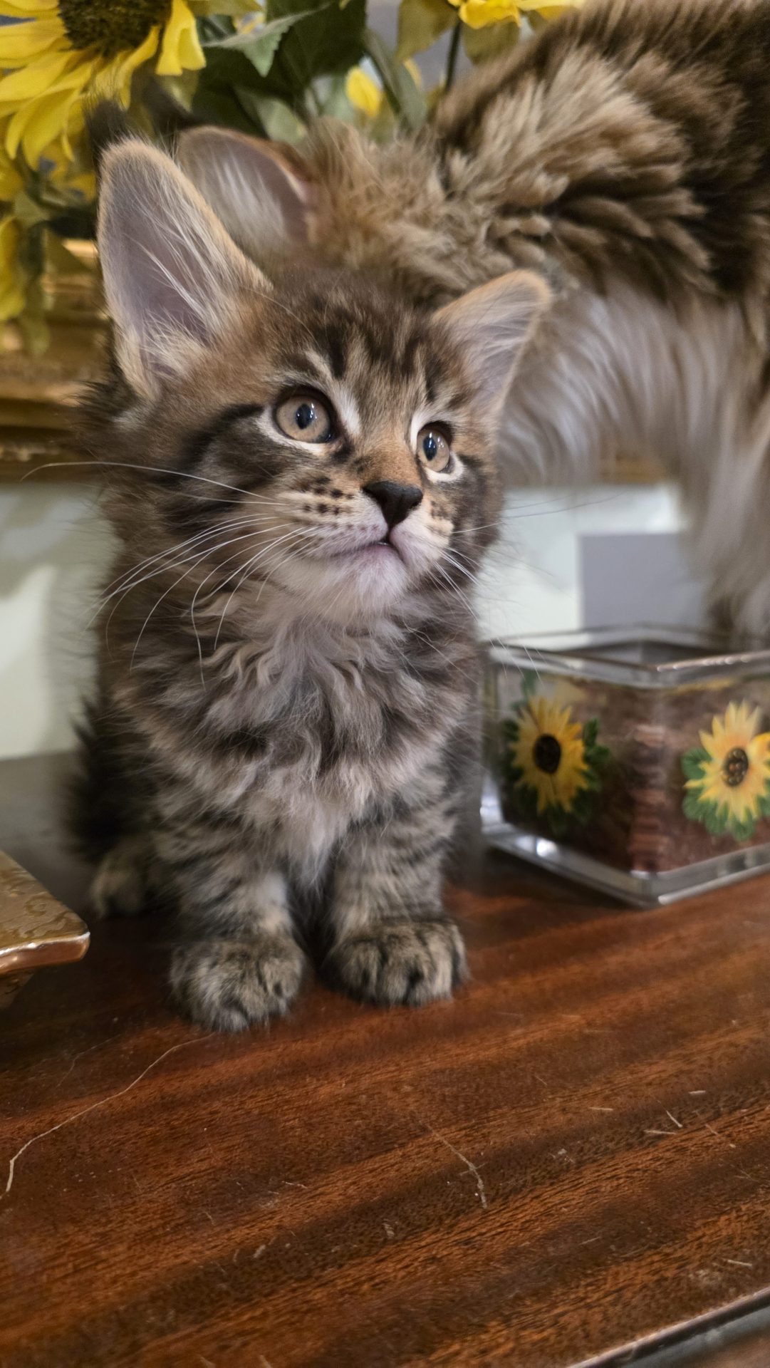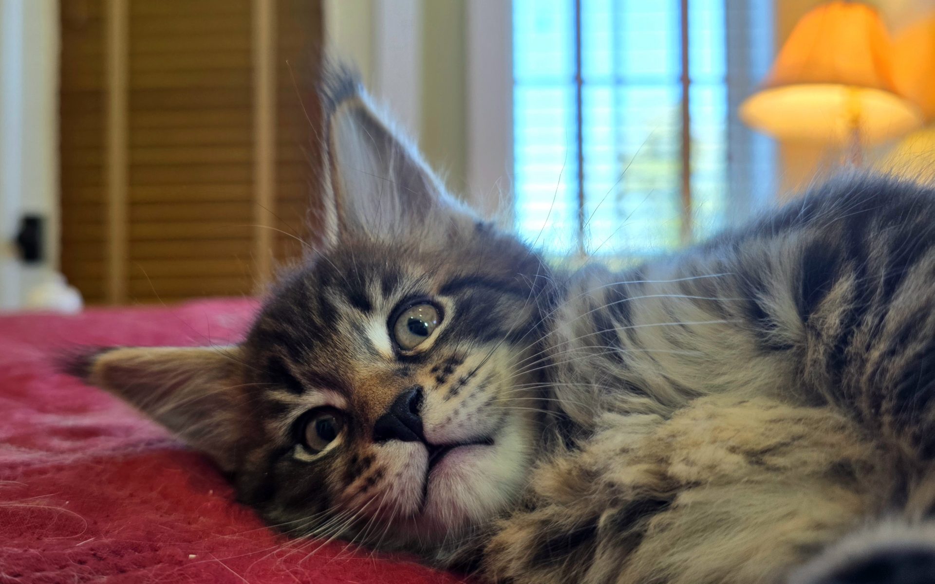 Reserved JOINING PAST JELLICO DREAM KITTENS AXEL, BODE, AND TAHOE IN THE WONDERFUL VENTRESCO FAMILY IN BOSTON!!! When I first saw this kitten, her aura brought me visions of a Classic Brown Tabby Maine Coon standing at the edge of the North Woods in the soft moonlight. So I decided to call her Moonlight. I still have that vision in my mind every time I gaze at her. This is a confident gal who holds her own playing with the boys but cuddles better than any of them. She loves belly rubs, loves to ride on my shoulder, and loves to sleep in the crook of my arm when I take a nap with her litter. Her eyes are deep and warm and full of love and fun. If Robert Frost had seen this girl when "Stopping By the Woods on a Snowy Evening," his poem would have turned out quite differently!
