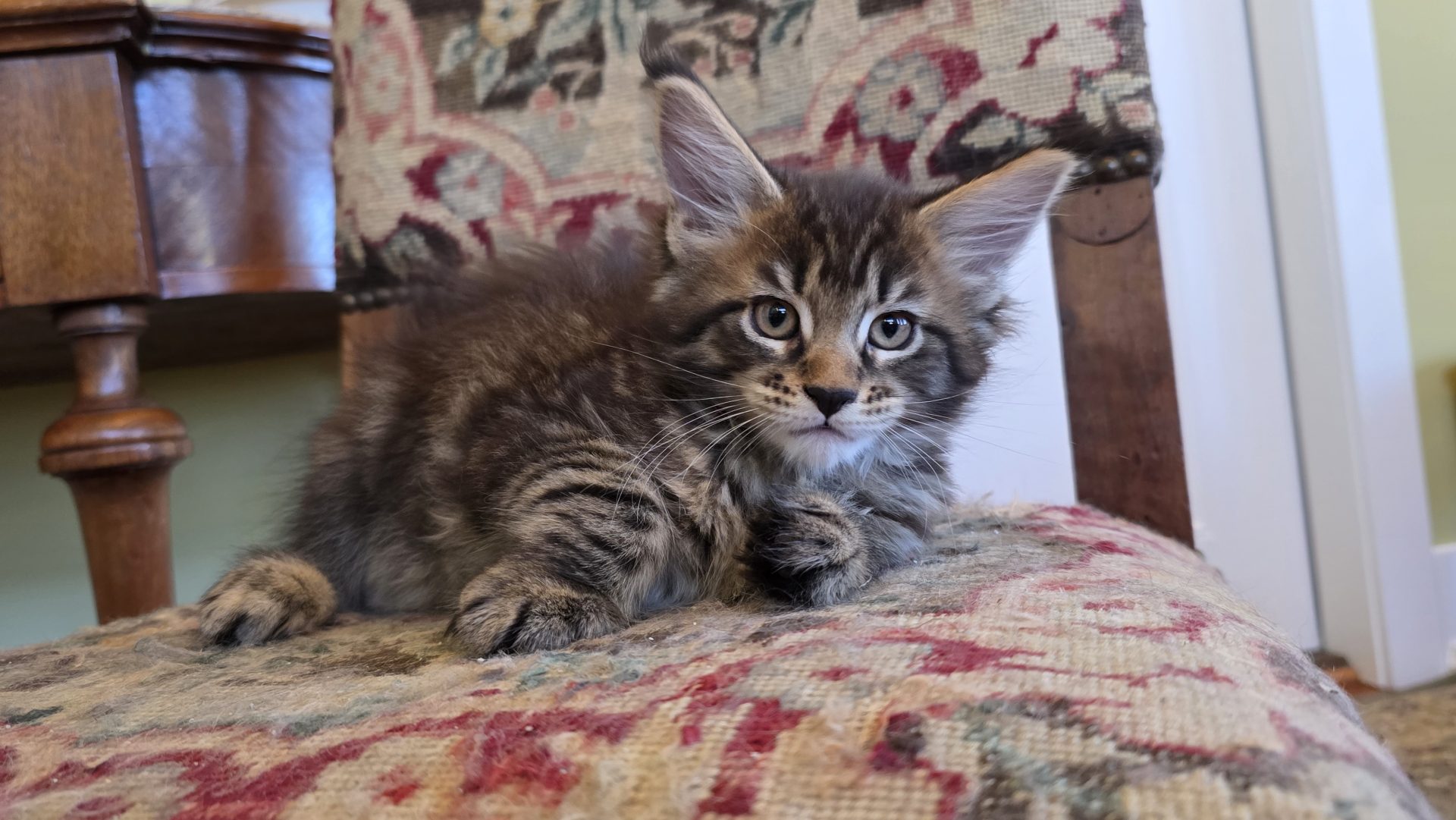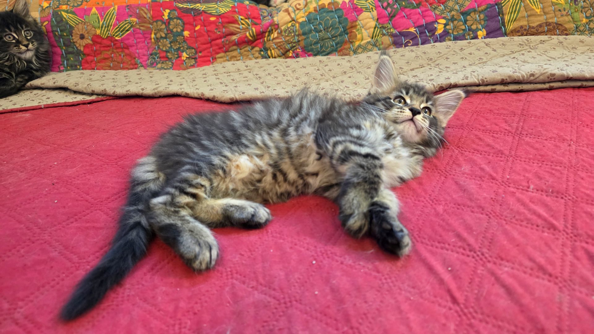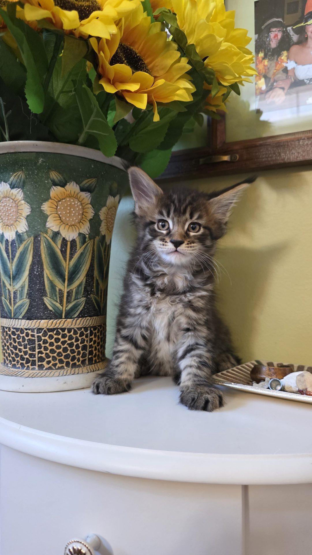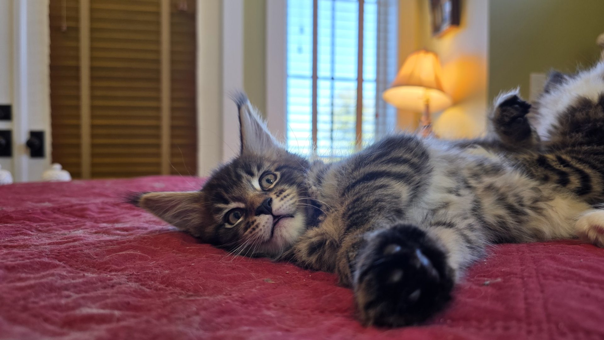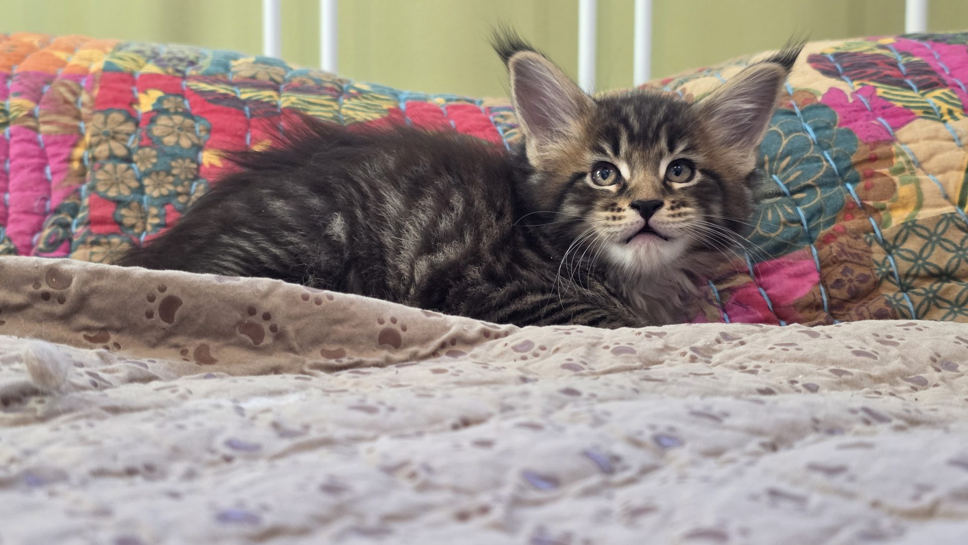 Reserved JOINING PAST JELLICO DREAM KITTENS AXEL, BODE, AND TAHOE IN THE WONDERFUL VENTRESCO FAMILY IN BOSTON!!! When I first saw this kitten, her aura brought me visions of a Classic Brown Tabby Maine Coon standing at the edge of the North Woods in the soft moonlight. So I decided to call her Moonlight. I still have that vision in my mind every time I gaze at her. This is a confident gal who holds her own playing with the boys but cuddles better than any of them. She loves belly rubs, loves to ride on my shoulder, and loves to sleep in the crook of my arm when I take a nap with her litter. Her eyes are deep and warm and full of love and fun. If Robert Frost had seen this girl when "Stopping By the Woods on a Snowy Evening," his poem would have turned out quite differently!