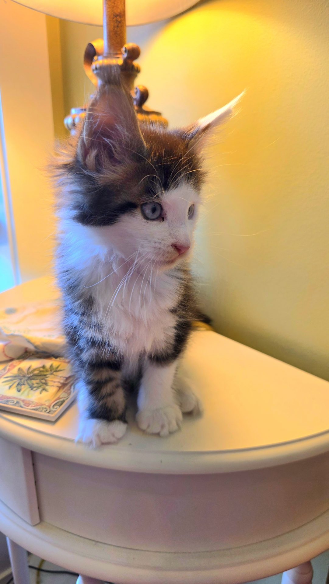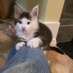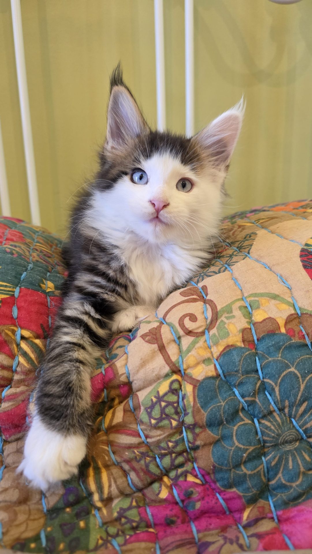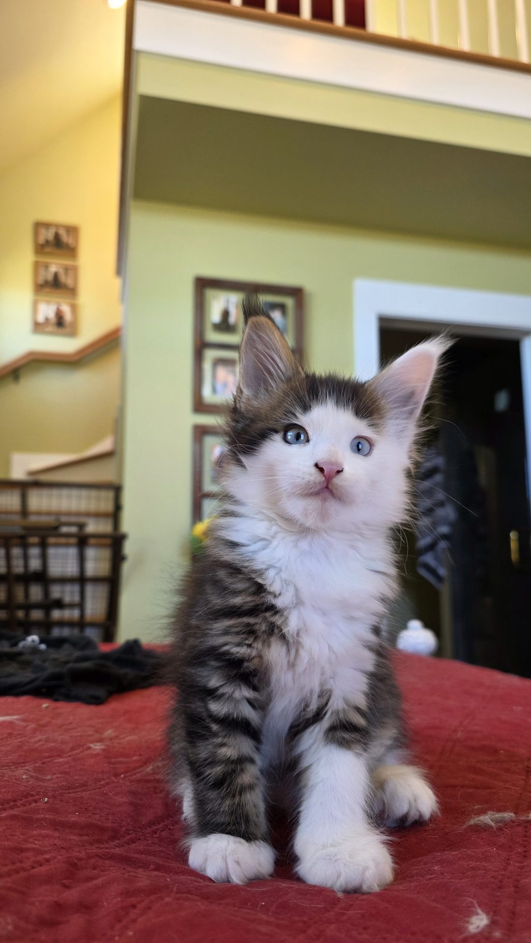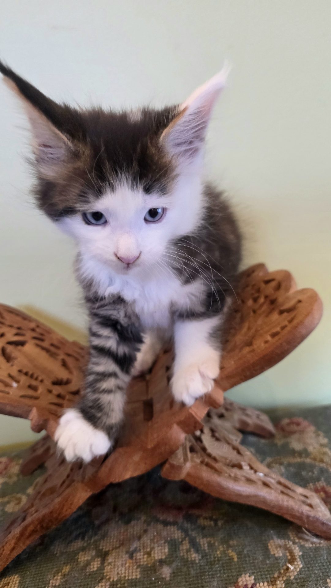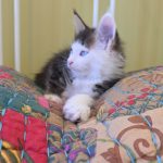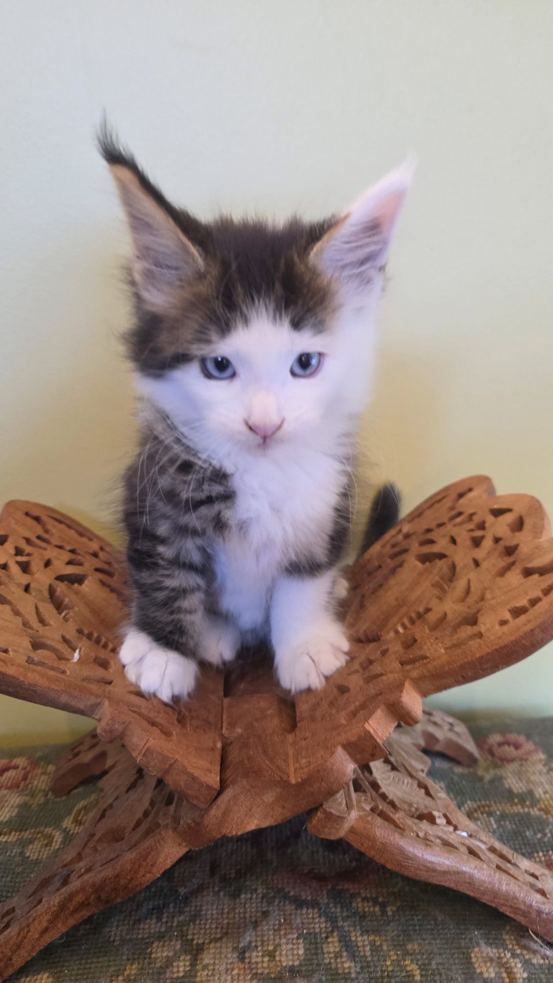 Reserved SOON TO BE MELTING THE HEART OF THE ONE AND ONLY ASHLEY SPOTSWOOD OF MOUNTAIN BROOK, ALABAMA!!! Ashley Spotswood is a special lady. A very kind, talented, elegant, classy and beautiful lady whom I have known for 41 years. Her husband and daughter conspired with me to get her a Maine Coon kitten for Christmas to fulfill her lifelong dream. When Ashley's daughter told me this, I told her that a very special lady deserves a very special kitten. Preacher is a very special kitten. His rare forever blue eyes beam love and sweetness in unspoken but unmistakable terms. His harlequin coat and facial patterns are just as endearing. He has one white ear tip and one black ear tip, and both will be huge. But the very best things about Preacher are his huge heart and sweet soul that are just begging for a deep and magical bond with a human all his own. That bond is what makes all Maine Coons special. The very best Maine Coons want it just a little bit more. Preacher has been yearning for that bond since he opened those gorgeous blue eyes. Ashley will be his dream come true. And he will be hers. This is a match made in Heaven.