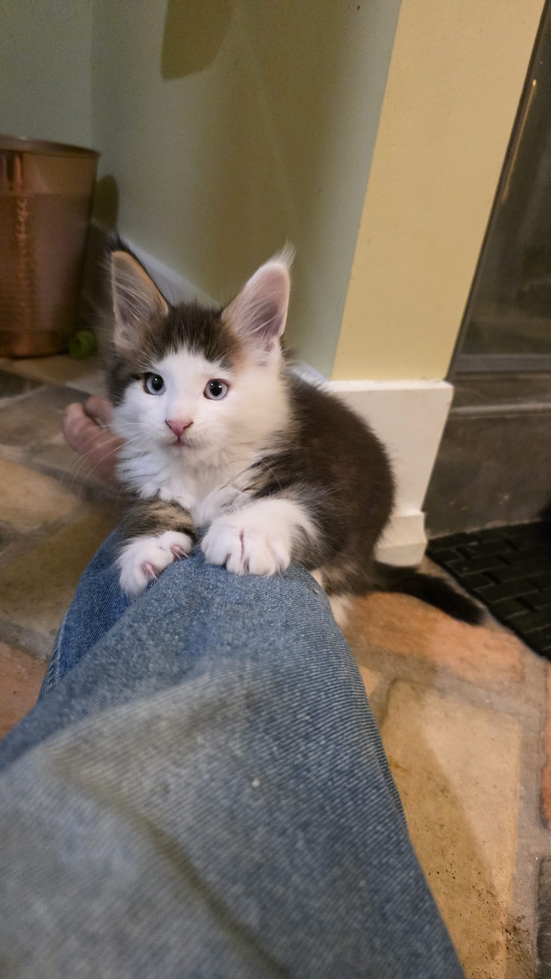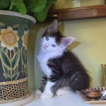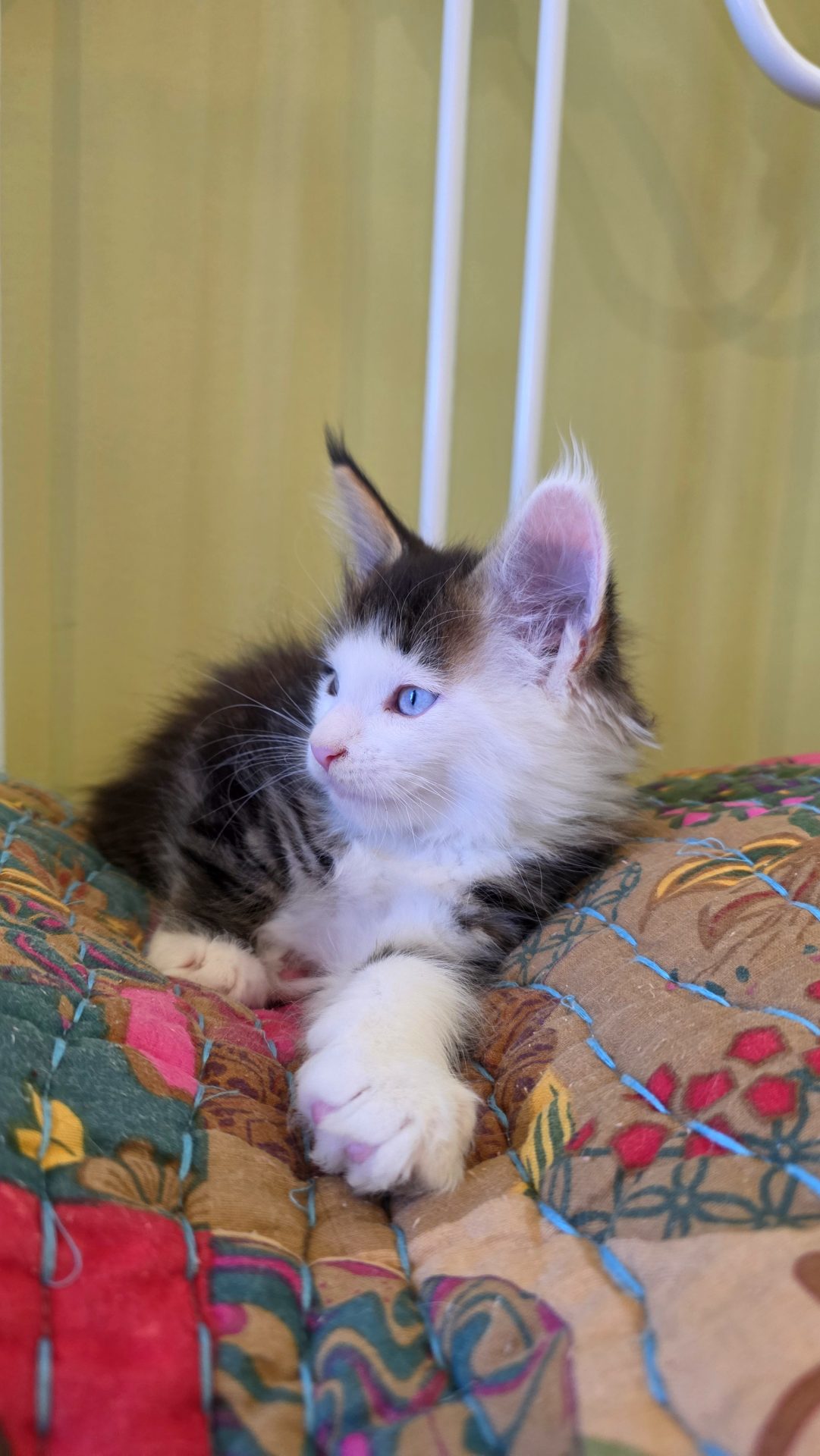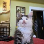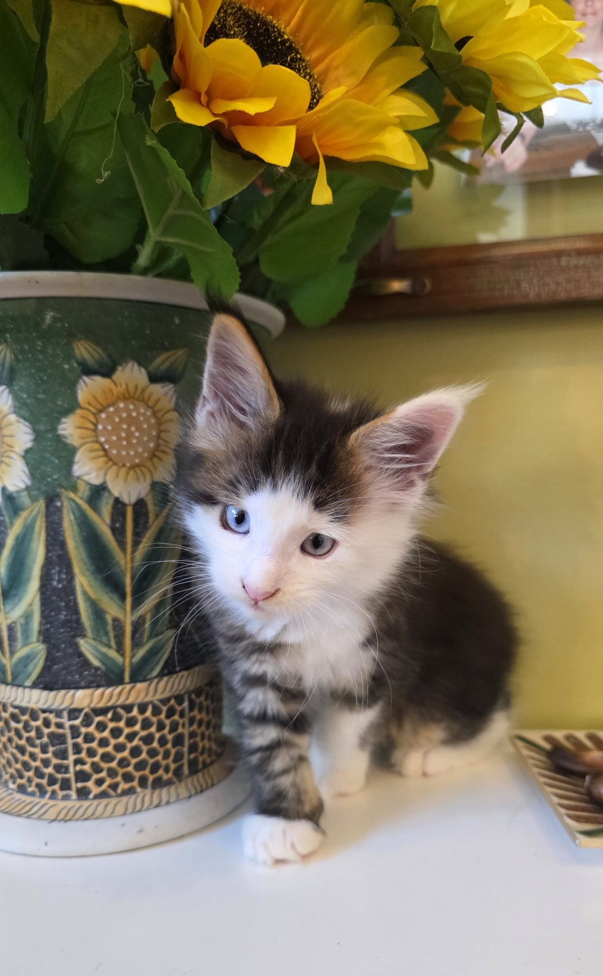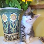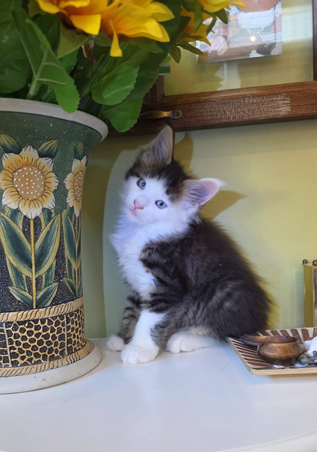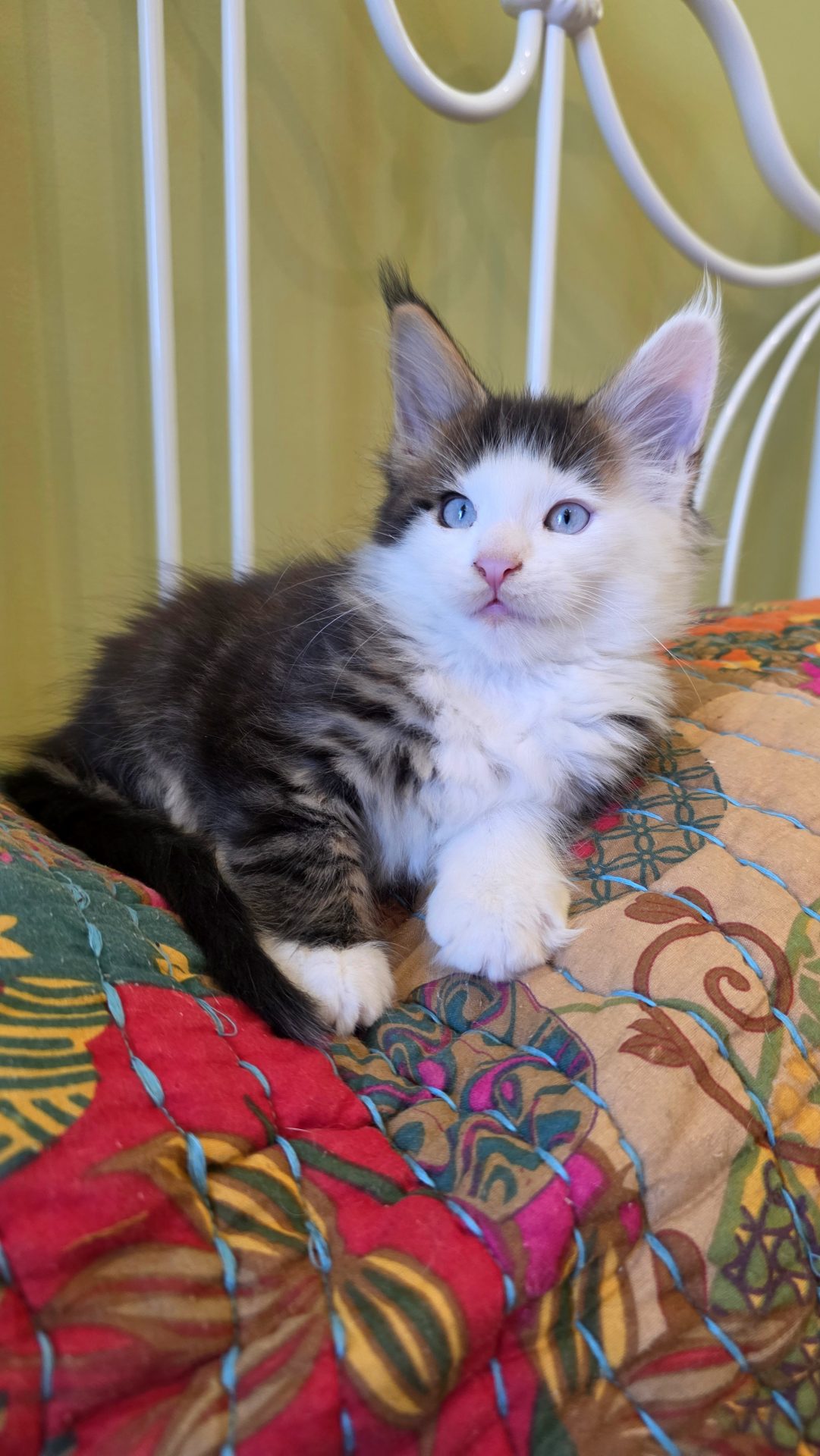 Reserved SOON TO BE MELTING THE HEART OF THE ONE AND ONLY ASHLEY SPOTSWOOD OF MOUNTAIN BROOK, ALABAMA!!! Ashley Spotswood is a special lady. A very kind, talented, elegant, classy and beautiful lady whom I have known for 41 years. Her husband and daughter conspired with me to get her a Maine Coon kitten for Christmas to fulfill her lifelong dream. When Ashley's daughter told me this, I told her that a very special lady deserves a very special kitten. Preacher is a very special kitten. His rare forever blue eyes beam love and sweetness in unspoken but unmistakable terms. His harlequin coat and facial patterns are just as endearing. He has one white ear tip and one black ear tip, and both will be huge. But the very best things about Preacher are his huge heart and sweet soul that are just begging for a deep and magical bond with a human all his own. That bond is what makes all Maine Coons special. The very best Maine Coons want it just a little bit more. Preacher has been yearning for that bond since he opened those gorgeous blue eyes. Ashley will be his dream come true. And he will be hers. This is a match made in Heaven.