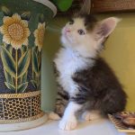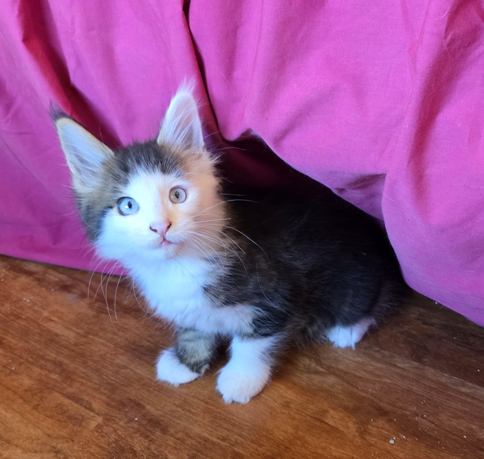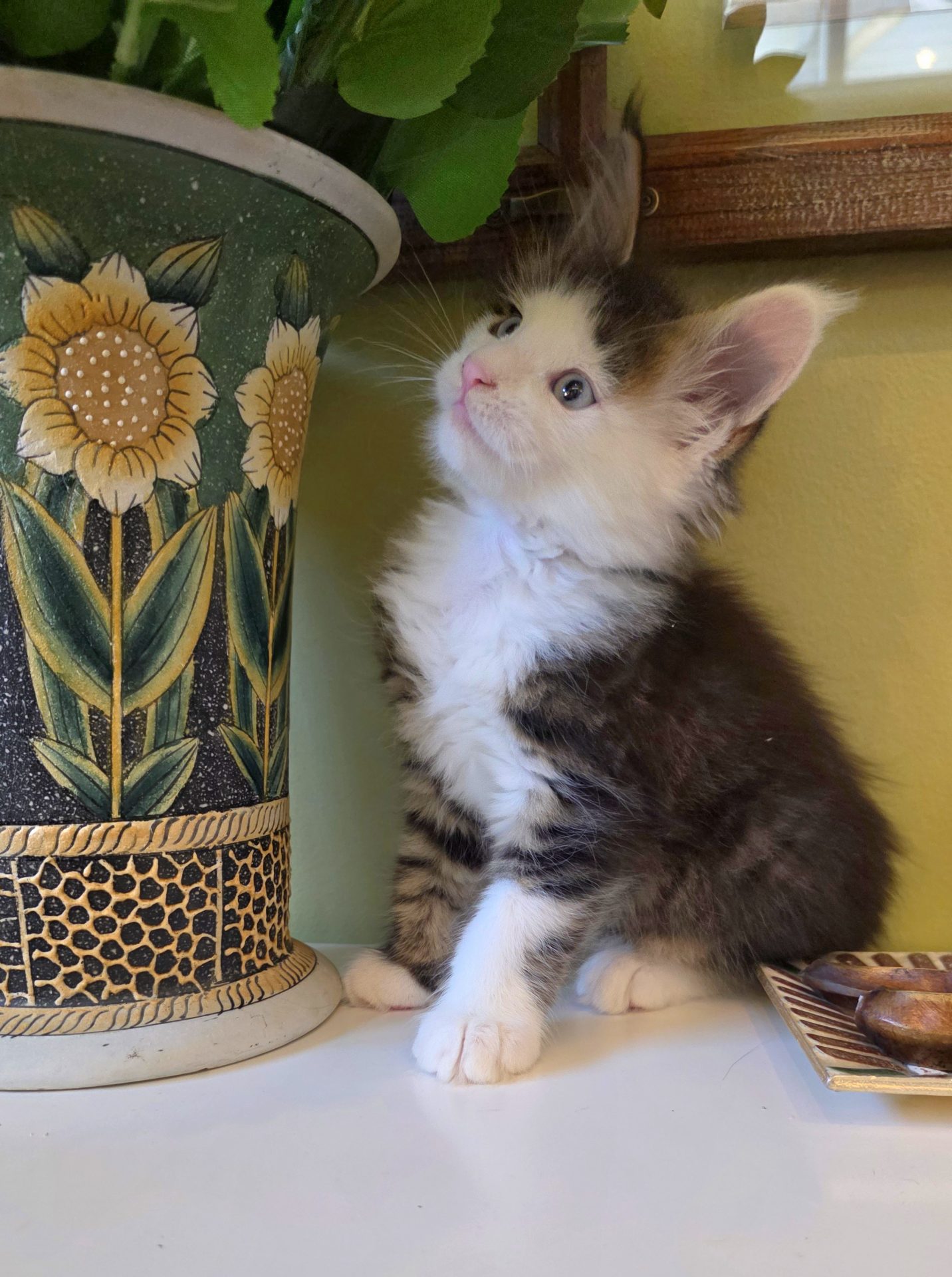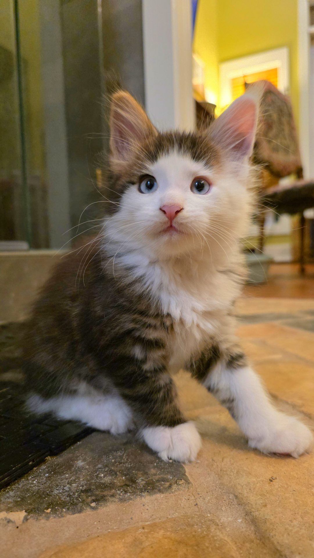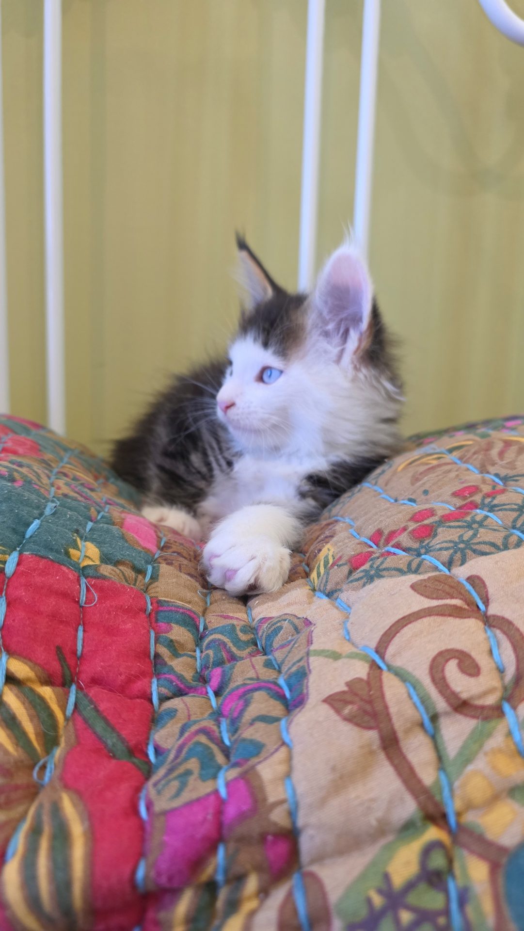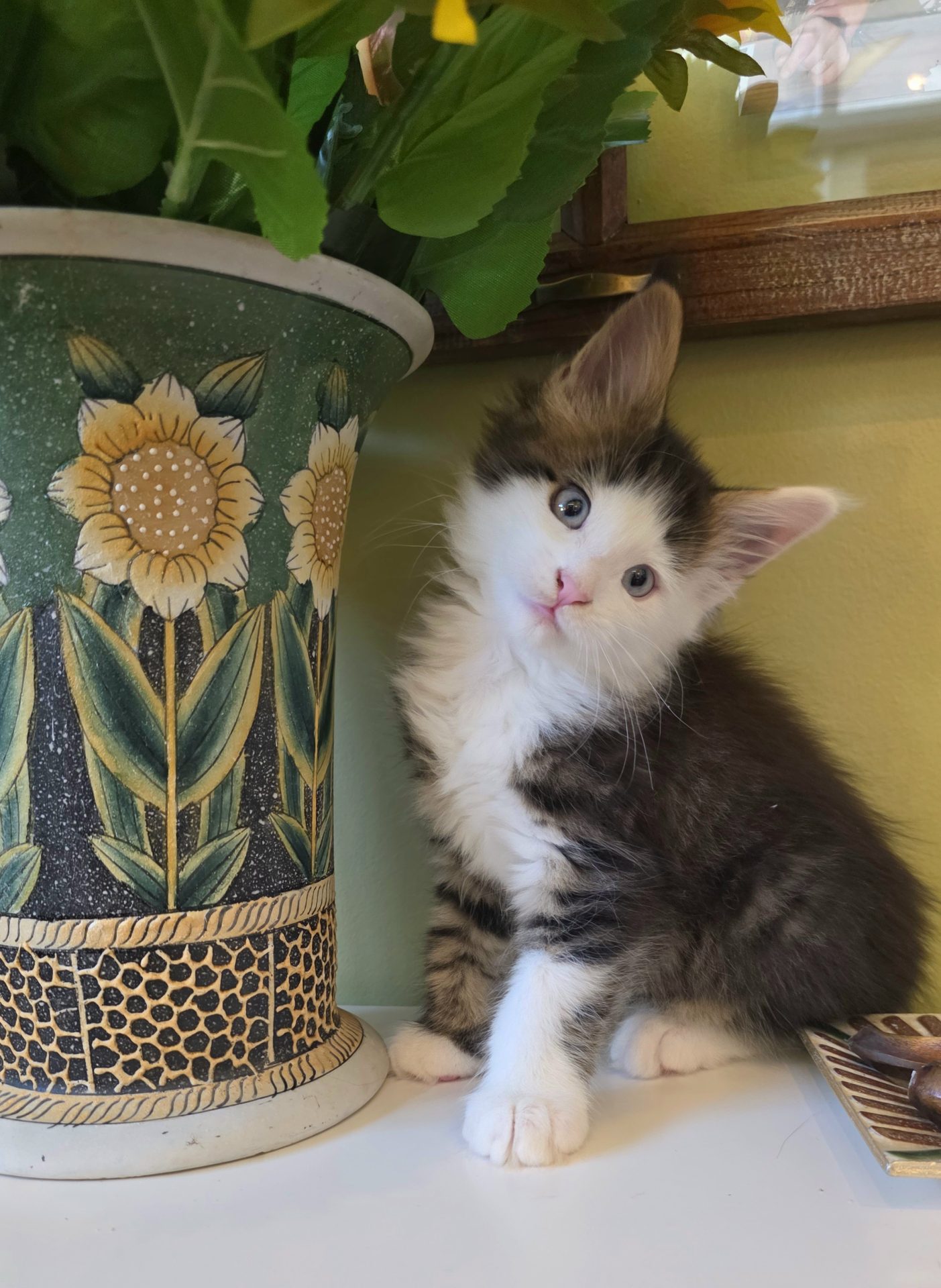 Reserved SOON TO BE MELTING THE HEART OF THE ONE AND ONLY ASHLEY SPOTSWOOD OF MOUNTAIN BROOK, ALABAMA!!! Ashley Spotswood is a special lady. A very kind, talented, elegant, classy and beautiful lady whom I have known for 41 years. Her husband and daughter conspired with me to get her a Maine Coon kitten for Christmas to fulfill her lifelong dream. When Ashley's daughter told me this, I told her that a very special lady deserves a very special kitten. Preacher is a very special kitten. His rare forever blue eyes beam love and sweetness in unspoken but unmistakable terms. His harlequin coat and facial patterns are just as endearing. He has one white ear tip and one black ear tip, and both will be huge. But the very best things about Preacher are his huge heart and sweet soul that are just begging for a deep and magical bond with a human all his own. That bond is what makes all Maine Coons special. The very best Maine Coons want it just a little bit more. Preacher has been yearning for that bond since he opened those gorgeous blue eyes. Ashley will be his dream come true. And he will be hers. This is a match made in Heaven.