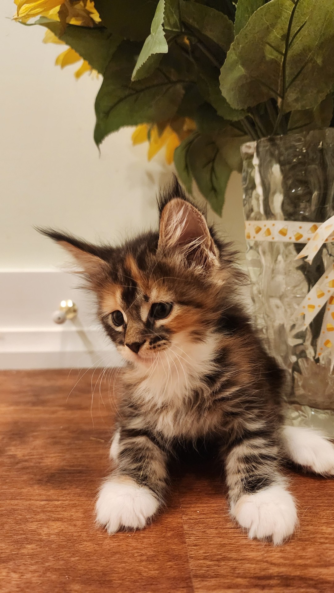 Sold NOW LIGHTING UP THE HOME OF ALEXIS, ANTHONY AND GRACIE CAPRIA IN NEW JERSEY!!! Pumpkin Spice is now Stevie! She is a gorgeous black and orange torbie with white accents. She and her littermates sounded like thunder when they were playing in the bedrooms above my living room. And this pretty girl is the one they all seemed to want to play with most. She loved to flirt with her littermates with all kinds of prances and pounces and hits and runs. I can't wait to see pics of her all grown up! With her precious black heart shaped nose and her golden orange adornments, she is going to be absolutely gorgeous! It took her just 2 days to win the heart of her new housemate, a beautiful adult Savannah cat named Gracie!