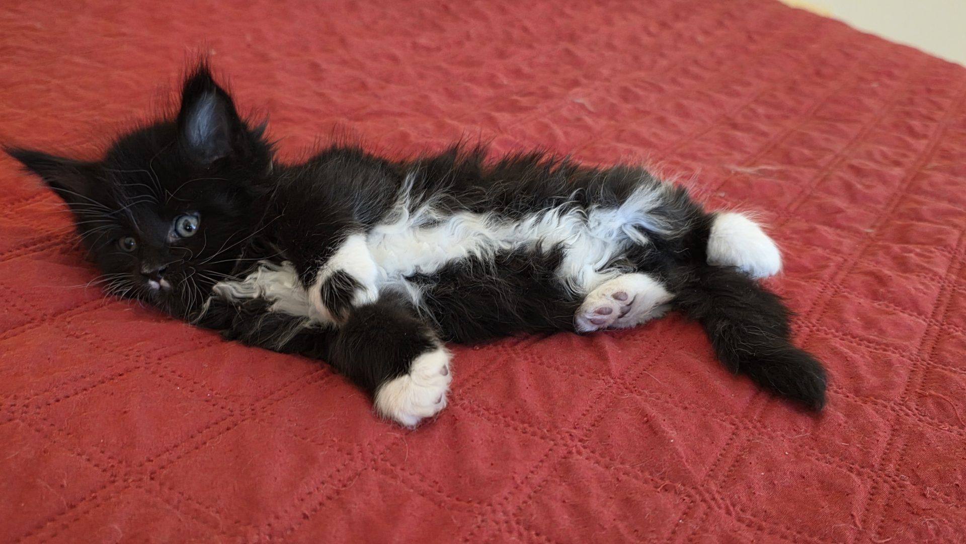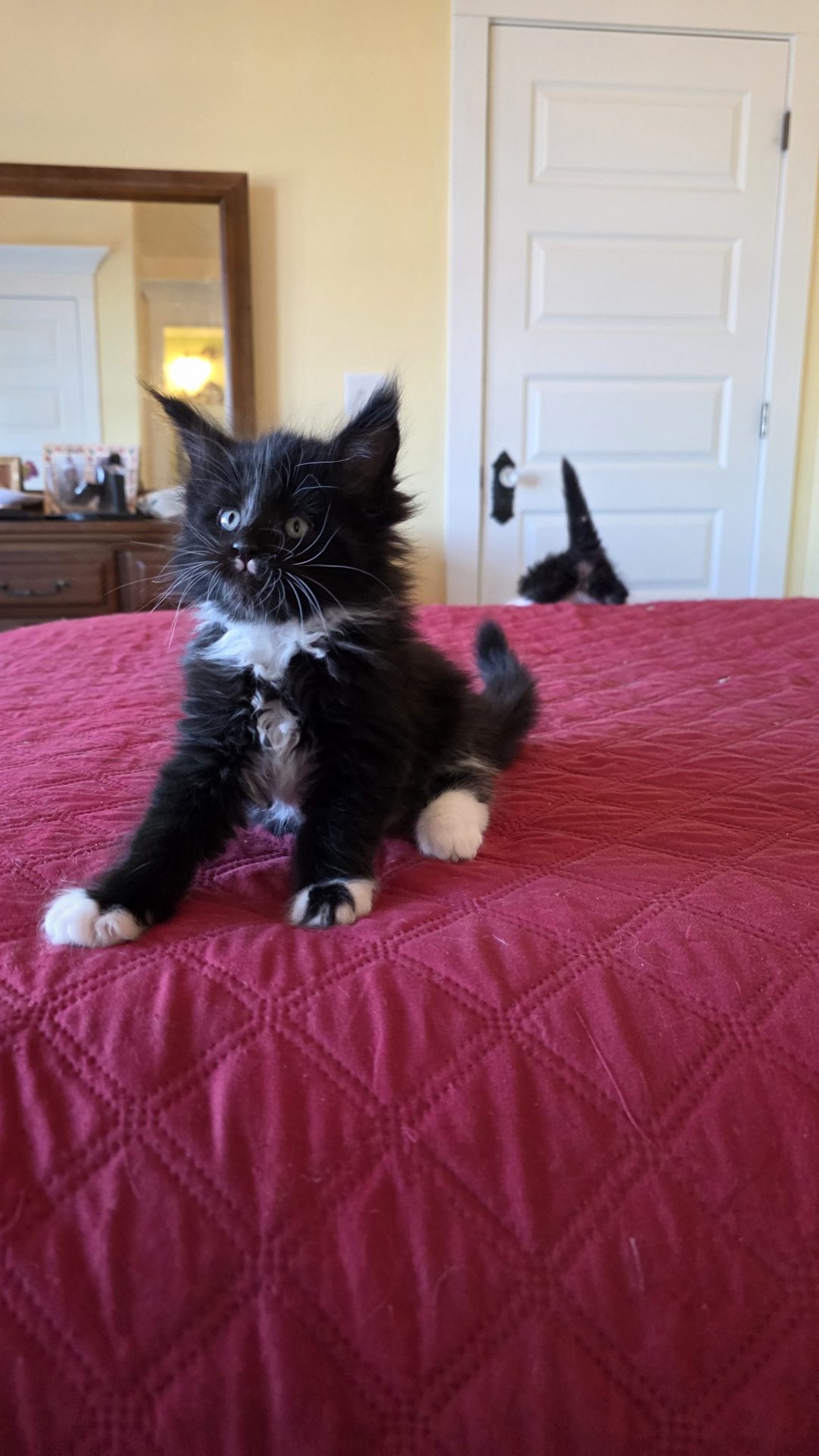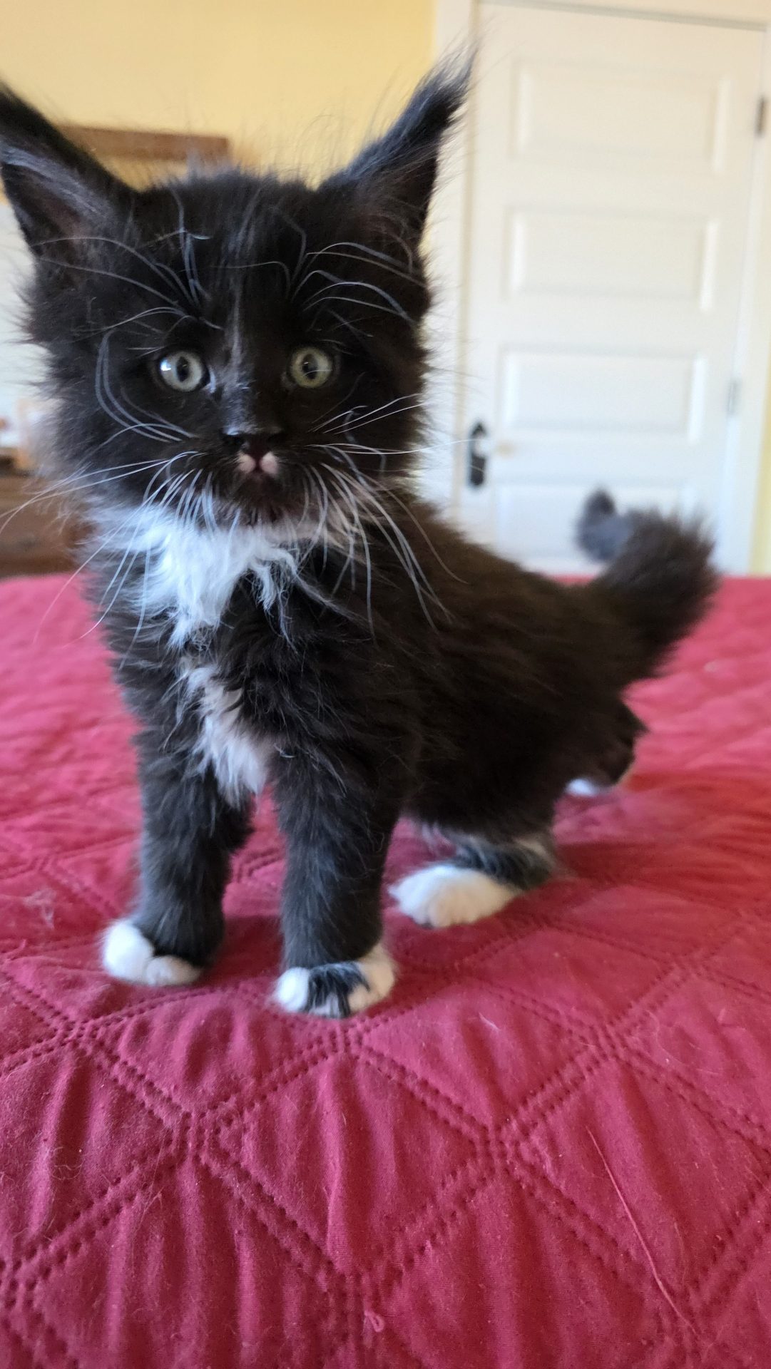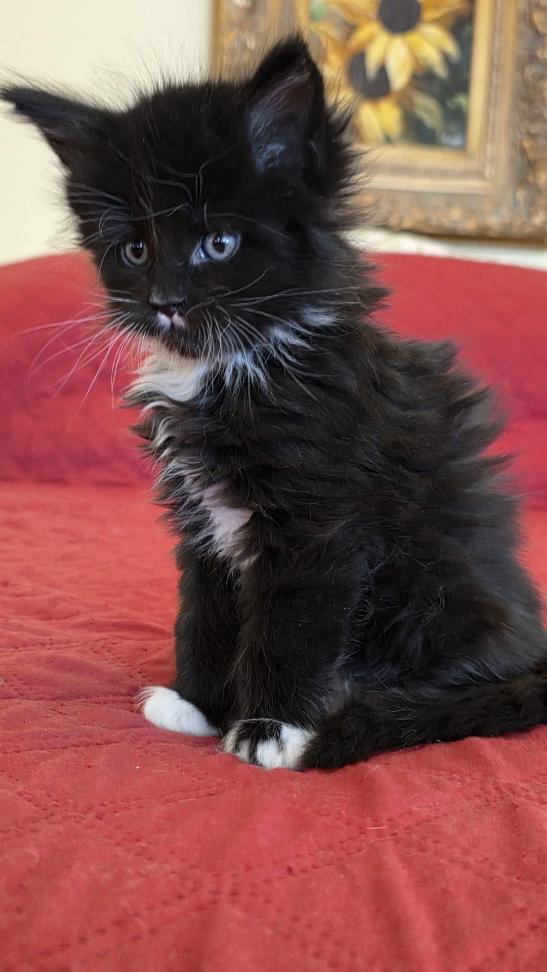 On Hold SOON TO BE THE BEST PRESENT UNDER THE TREE FOR RUBY KUZMA AND HER SON IN ROBERTSDALE, ALABAMA!!! This is Count Dracula in Maine Coon attire! He has the tuxedo, he has the white fangs, and he even has some magical markings on his left front paw! So I call this one The Count. His playfulness is not confined to nighttime, though. He is playful all the time. And he doesn't bite. But boy can he flirt! The Count will be absolutely majestic when he reaches full size in 3 years, and Ruby has promised to let me watch him grow up in pictures! I am thrilled for Ruby and her son, and so happy The Count has found such a good family to call his own!