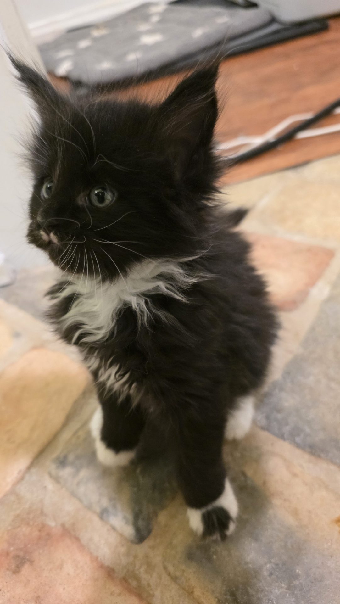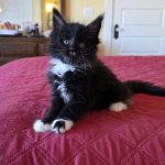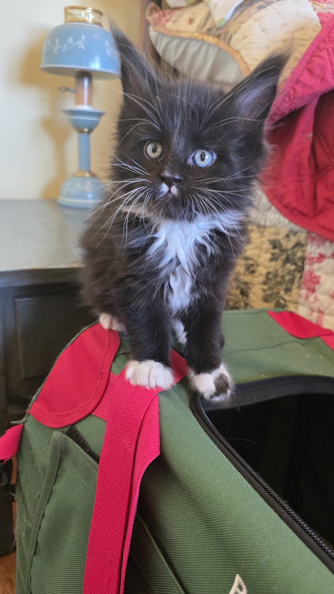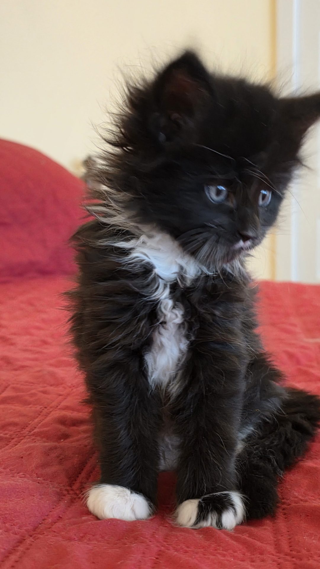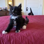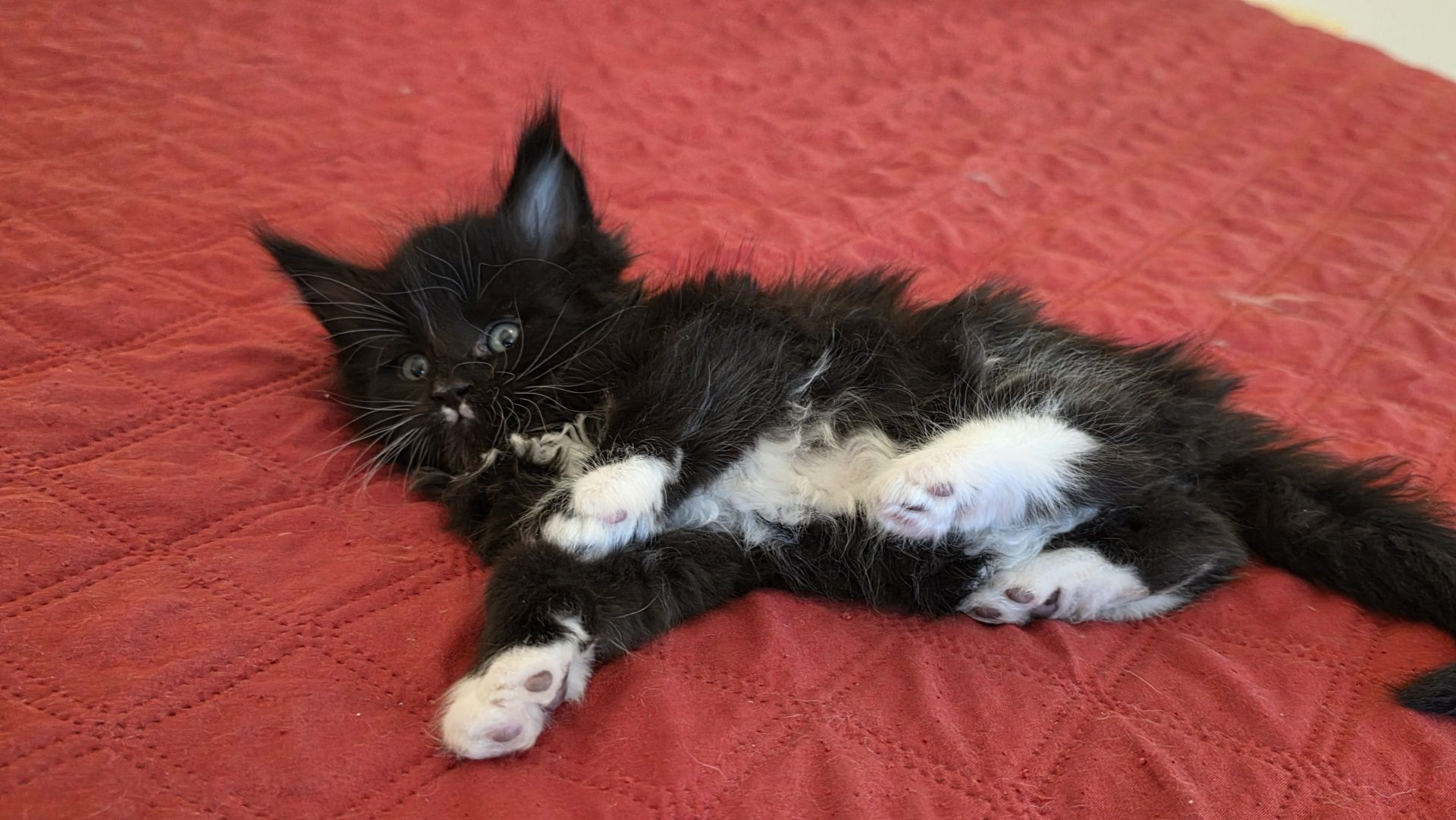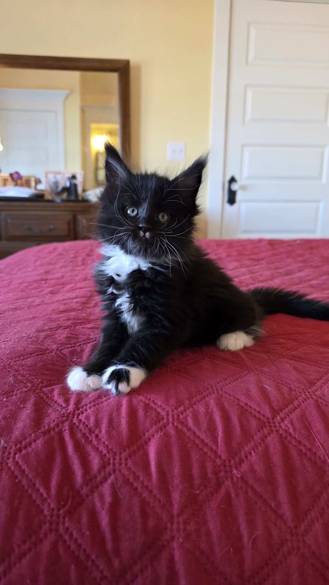 On Hold SOON TO BE THE BEST PRESENT UNDER THE TREE FOR RUBY KUZMA AND HER SON IN ROBERTSDALE, ALABAMA!!! This is Count Dracula in Maine Coon attire! He has the tuxedo, he has the white fangs, and he even has some magical markings on his left front paw! So I call this one The Count. His playfulness is not confined to nighttime, though. He is playful all the time. And he doesn't bite. But boy can he flirt! The Count will be absolutely majestic when he reaches full size in 3 years, and Ruby has promised to let me watch him grow up in pictures! I am thrilled for Ruby and her son, and so happy The Count has found such a good family to call his own!